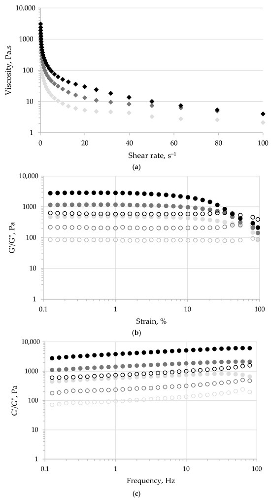 Figure 2c illustrates the findings of the frequency sweep experiments conducted within the LVR. Regardless of the carrot powder level, all roe salad samples exhibited significantly higher G′ values than G″ with no cross-over point, and both dynamic moduli increased over the whole frequency domain (Figure 2c). These results suggest that all samples presented elastic solid-like behavior, specific to the structured food systems with permanent interaction between molecules and aggregates [58,61,62].