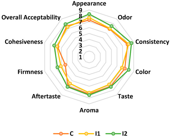 Comparative diagram of sensory attributes specific to the types of carp roe salad: C—carp roe salad without adding carrot powder, I1, and I2—carp roe salad with 6 and 12% carrot powder.
