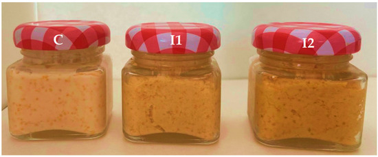 Carp roe salad with different percentages of carrot powder: C—carp roe salad without adding carrot powder, I1, and I2—carp roe salad with 6 and 12% carrot powder.