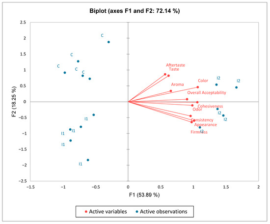 Principal component analysis biplot of the position of the three carp roe salads (C, I1, and I2) for sensory attribute evaluation.