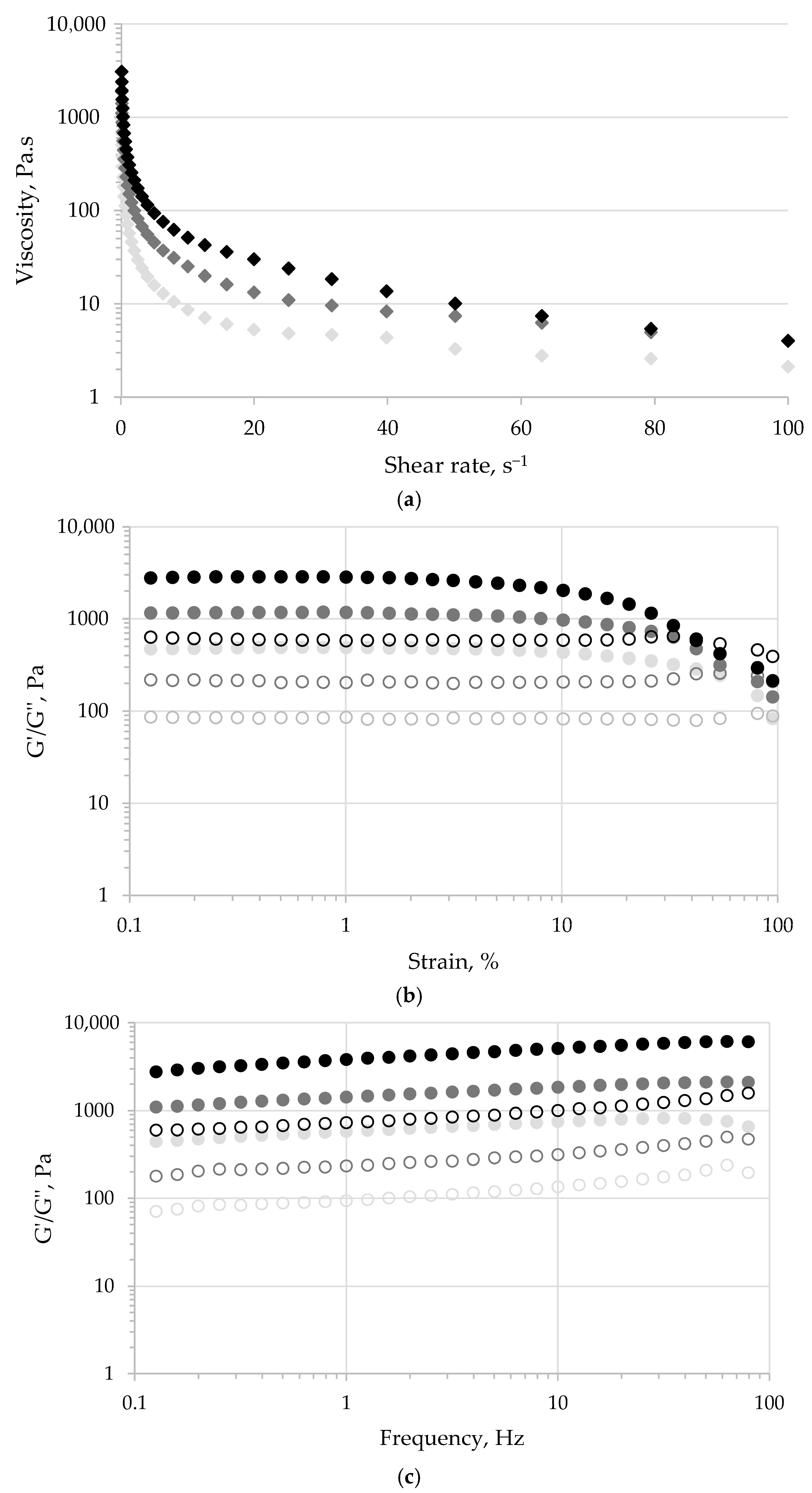 Table 6), indicating the gradual weakening of the molecular interactions due to increasing shearing. The apparent viscosity decrease was more pronounced in the first part of the shear rate domain, most probably due to the breaking of the intermolecular hydrogen bonds [