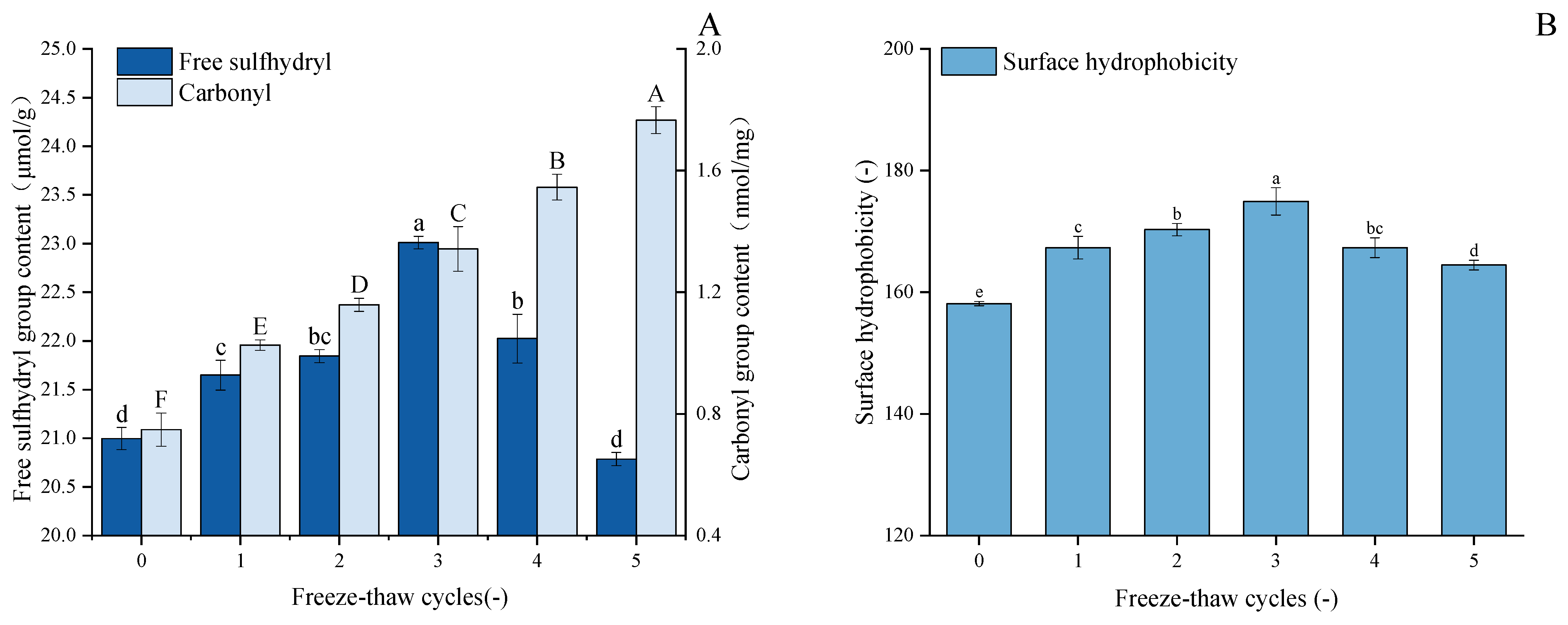- Wan, W.; Feng, J.; Wang, H.; Du, X.; Wang, B.; Yu, G.; Xia, X. Influence of repeated freeze-thaw treatments on the oxidation and degradation of muscle proteins from mirror carp (Cyprinus carpio L.), based on myofibrillar protein structural changes. Int. J. Biol. Macromol. 2023, 226, 454–462. [Google Scholar] [CrossRef] [PubMed]