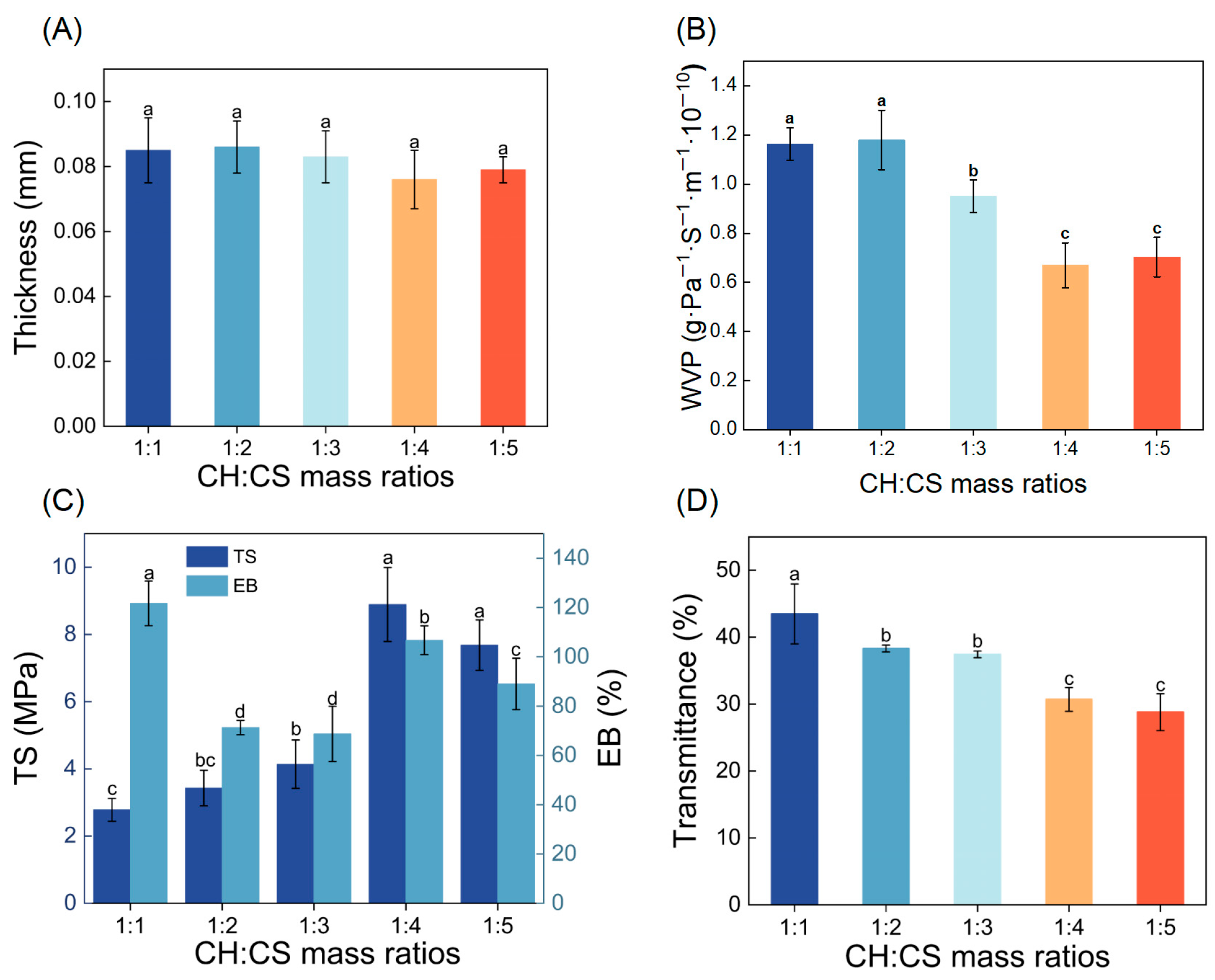 - Hasan, M.; Khaldun, I.; Zatya, I.; Rusman, R.; Nasir, M. Facile fabrication and characterization of an economical active packaging film based on corn starch–chitosan biocomposites incorporated with clove oil. J. Food Meas. Charact. 2023, 17, 306–316. [Google Scholar] [CrossRef]