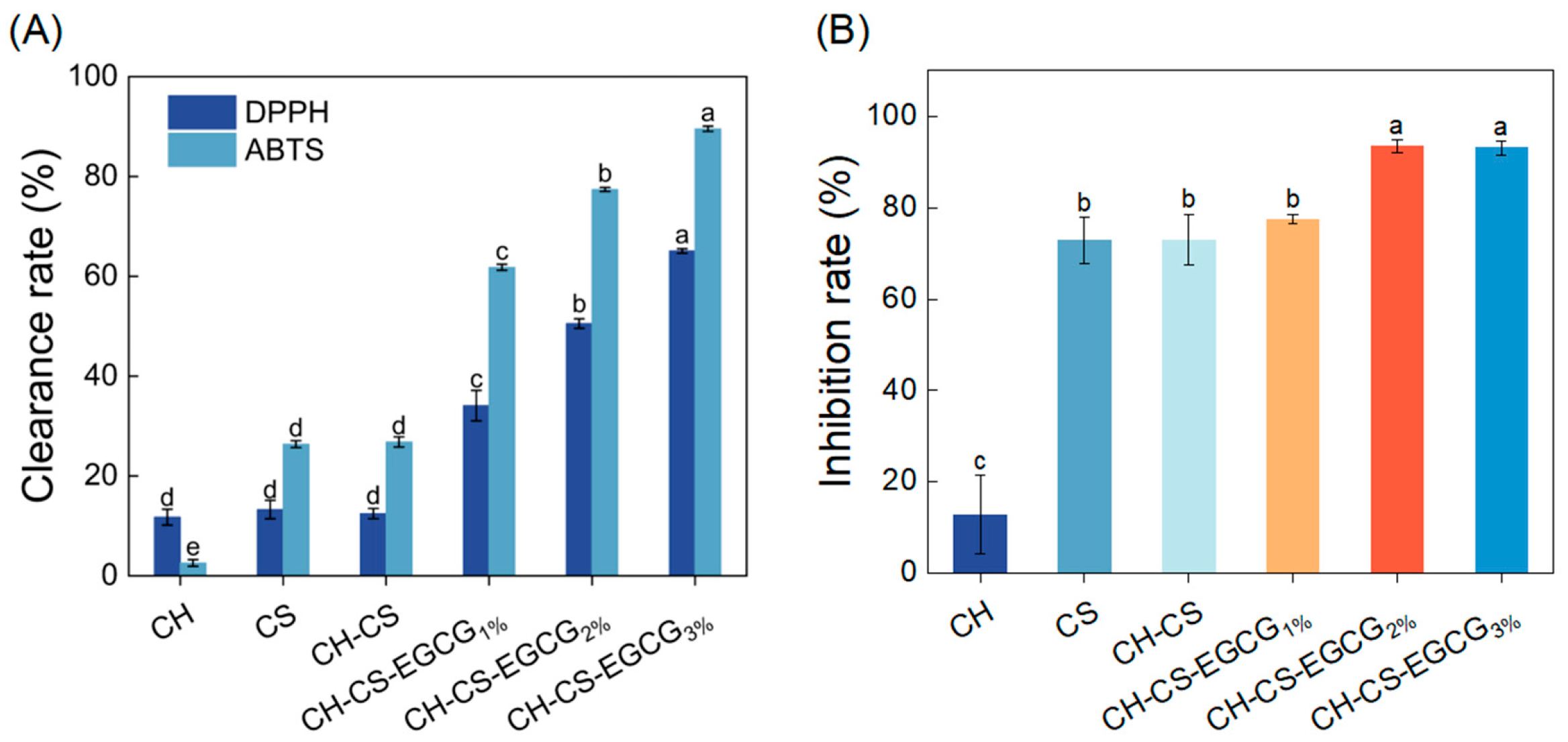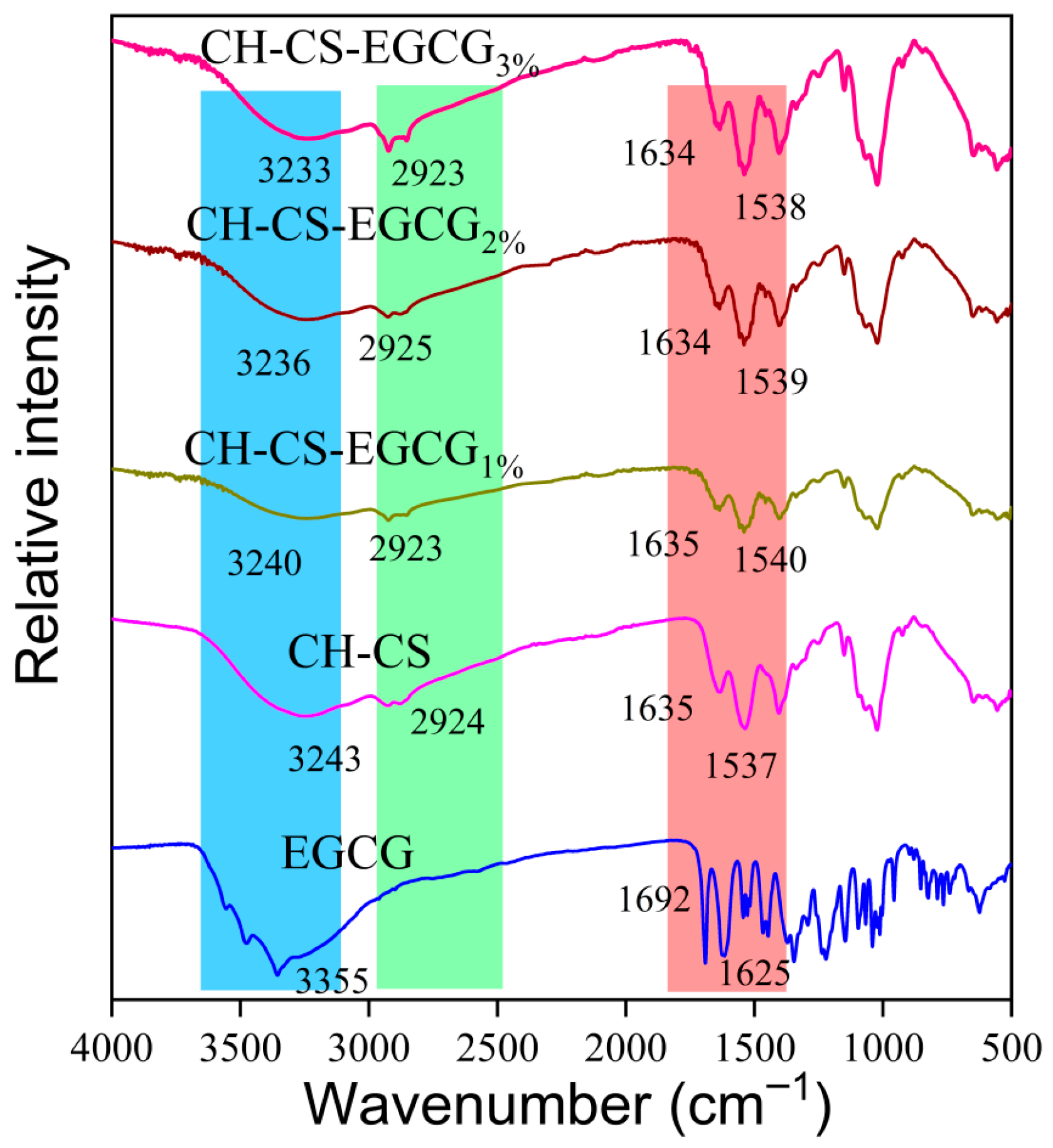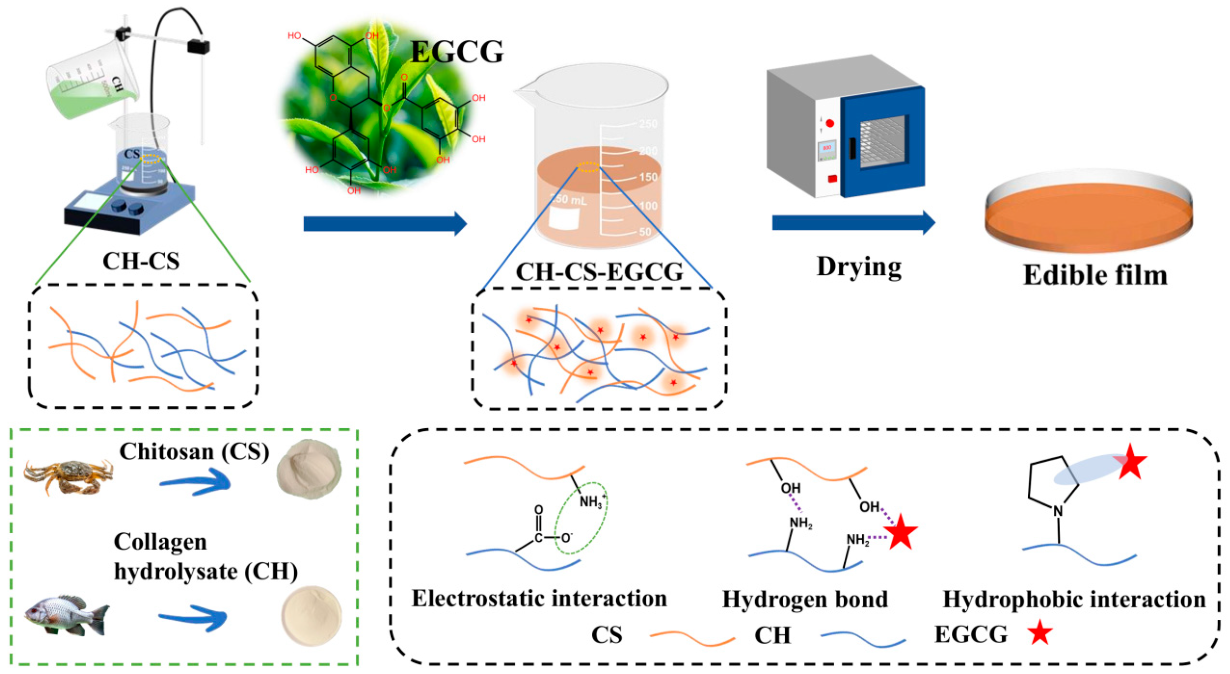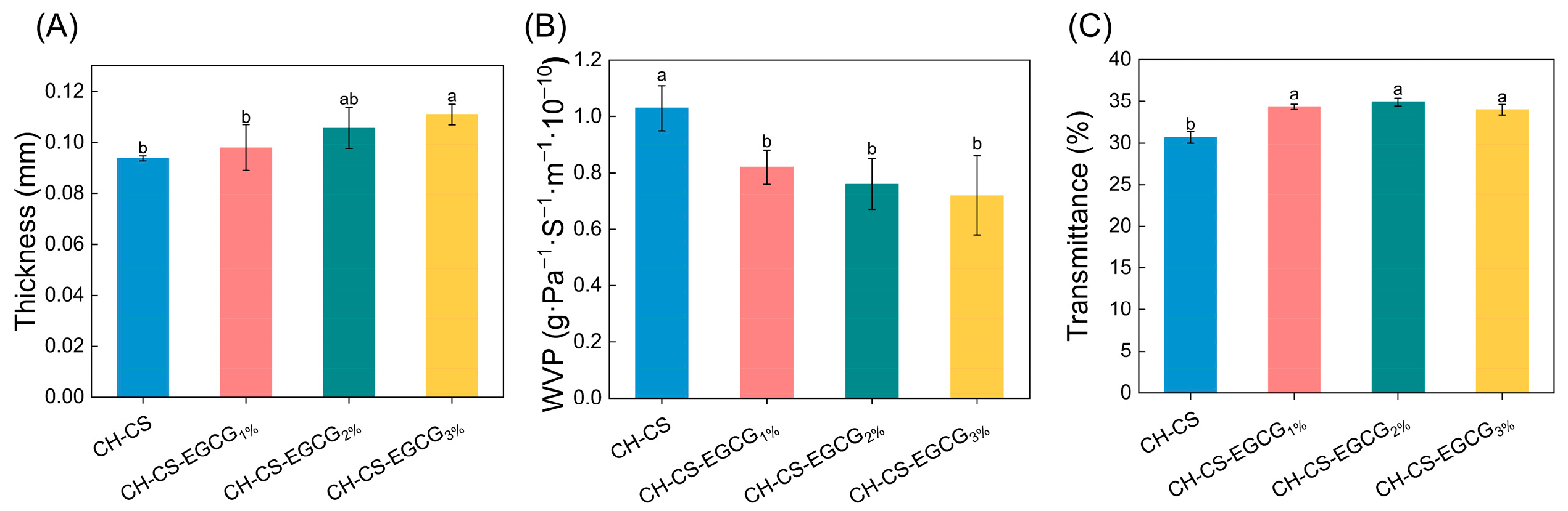 - Dai, W.; Zhou, L.; Gu, S.; Wang, W.; Xu, Z.; Zhou, X.; Ding, Y. Preparation and characterization of chitosan films incorporating epigallocatechin gallate: Microstructure, physicochemical, and bioactive properties. Int. J. Biol. Macromol. 2022, 211, 729–740. [Google Scholar] [CrossRef]
