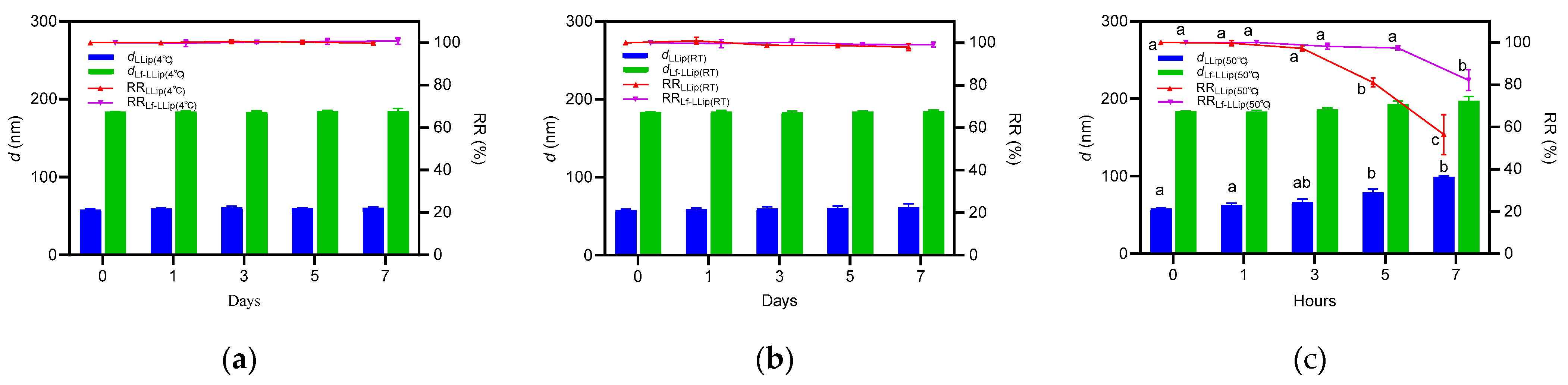 3.4.2. Effect of Temperature on the Stability of Lf-LLip