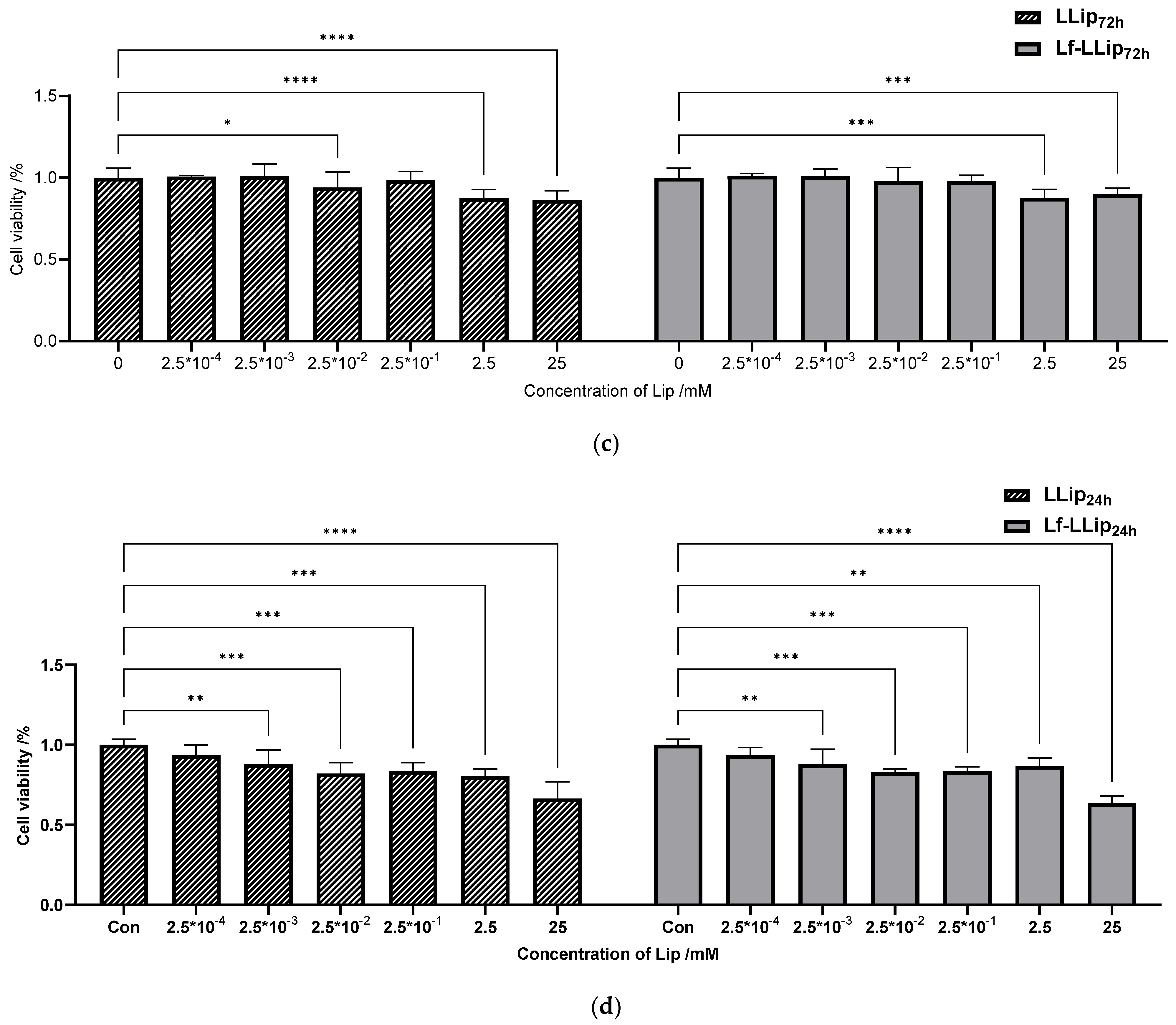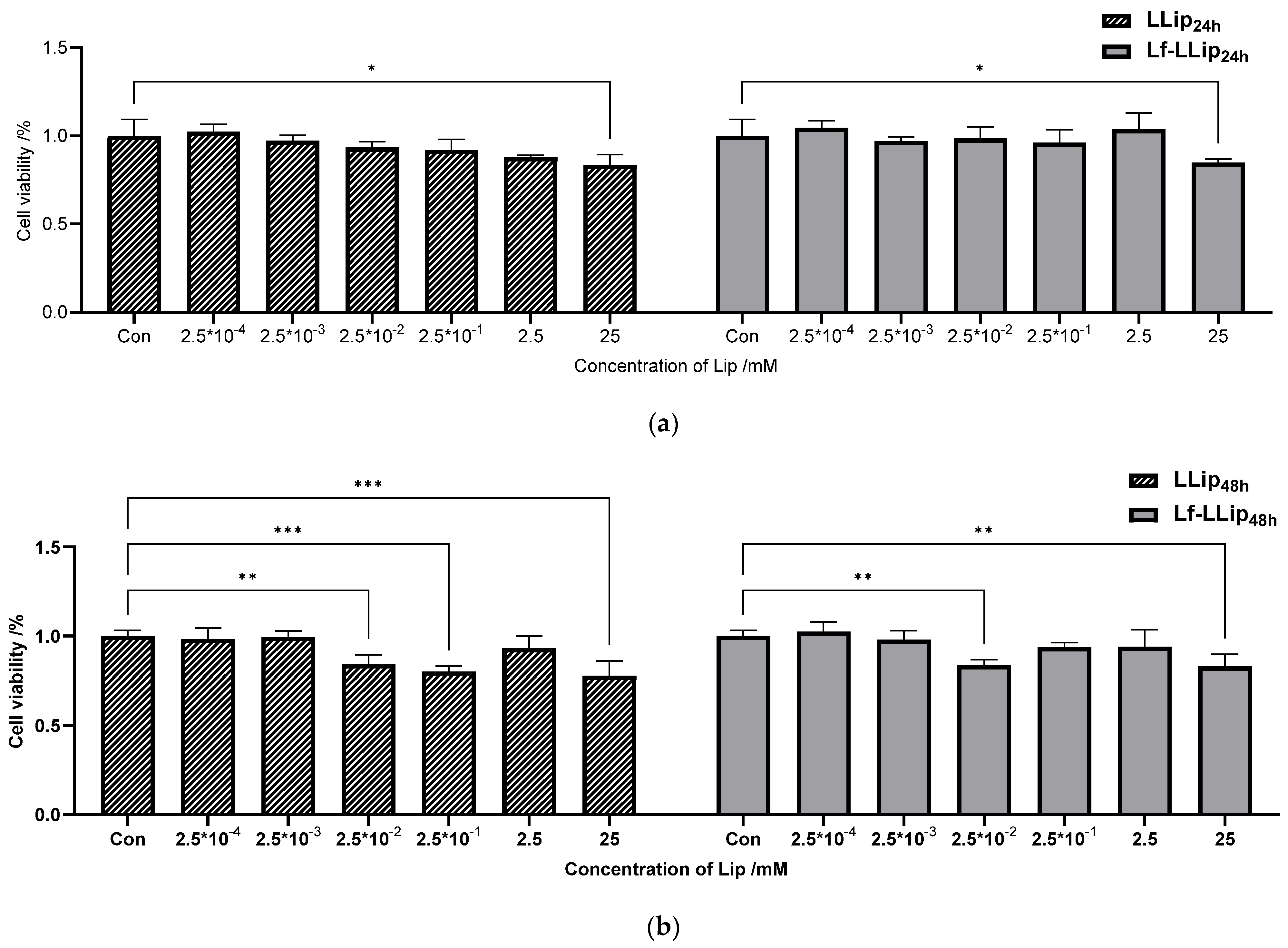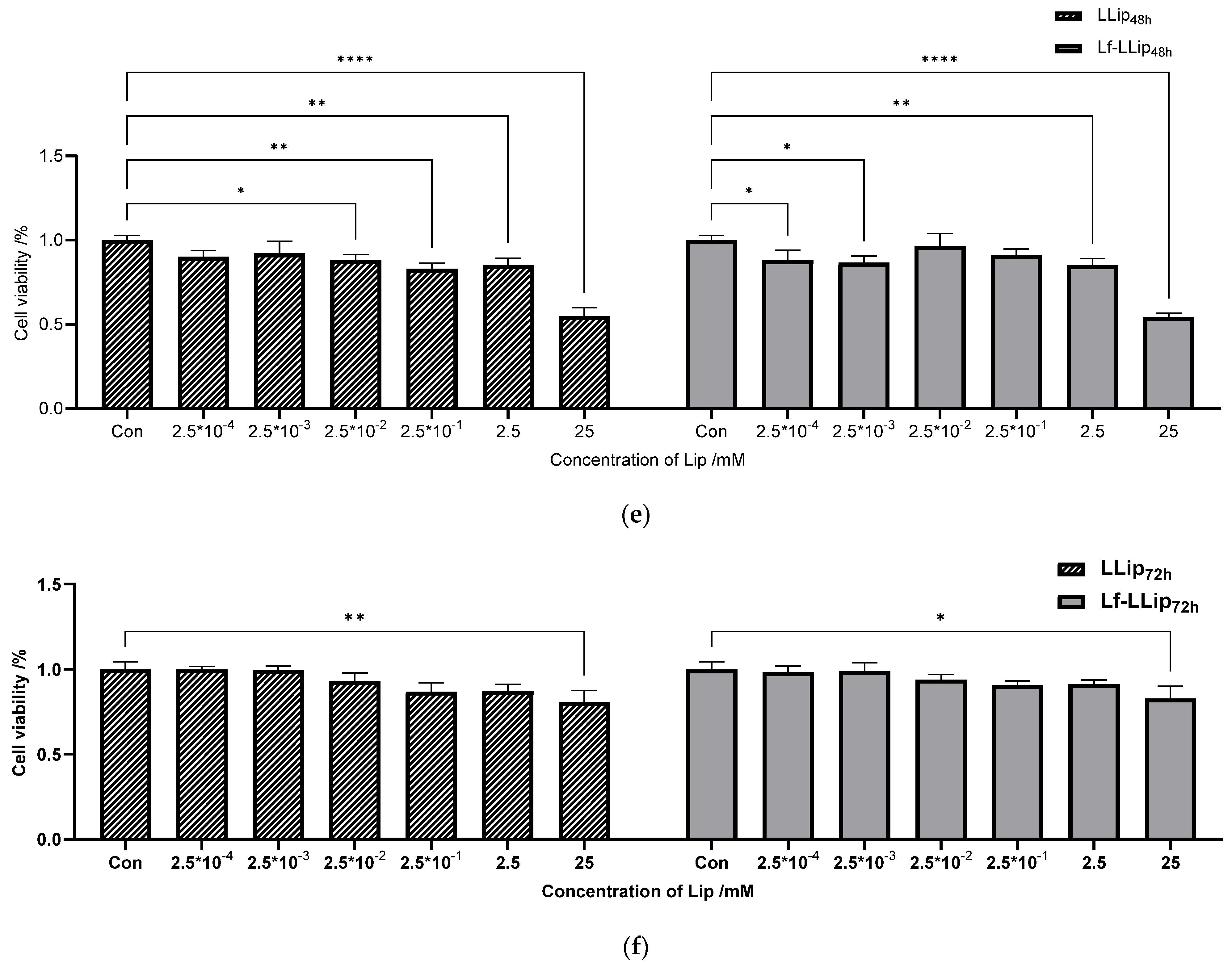 3.4. Stability of Lactoferrin-Modified Lutein Liposomes (Lf-LLips)