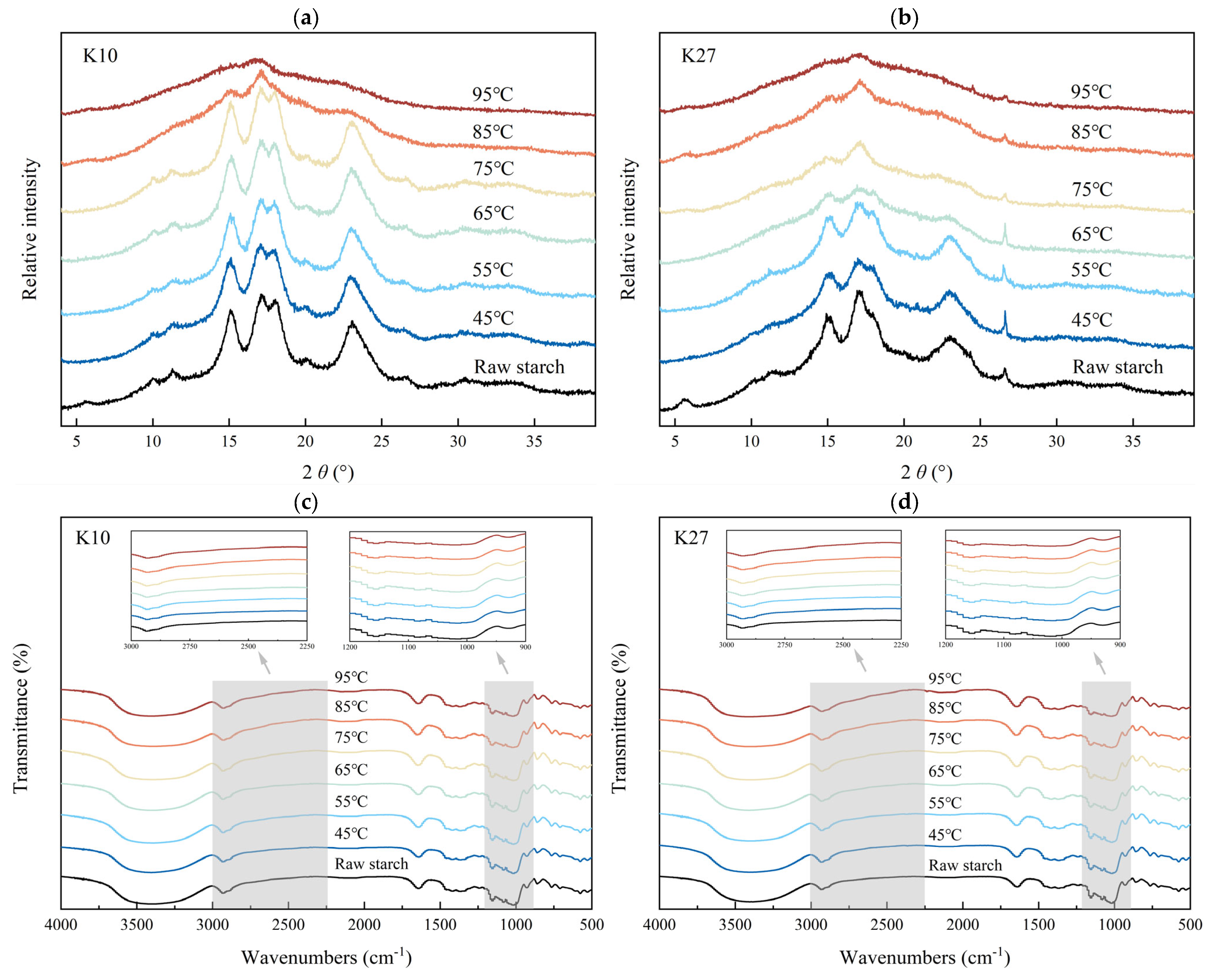 3.6. Effects of Different DG on the Long-Range Ordered Structure of Kudzu Starch