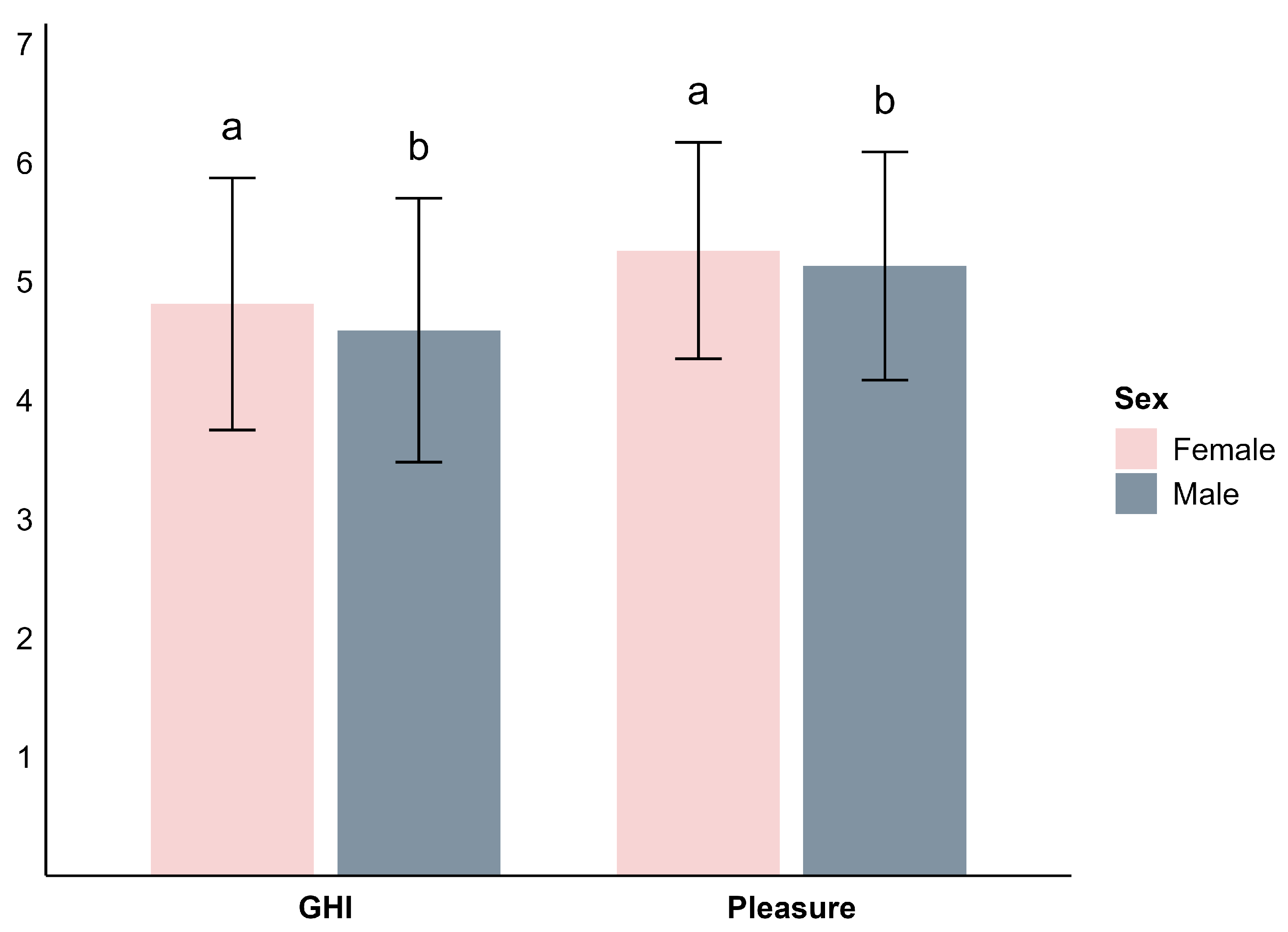 | Pleasure | 18–34 years old | 5.18 ± 0.92 | b | 12.4 | <0.001 |
