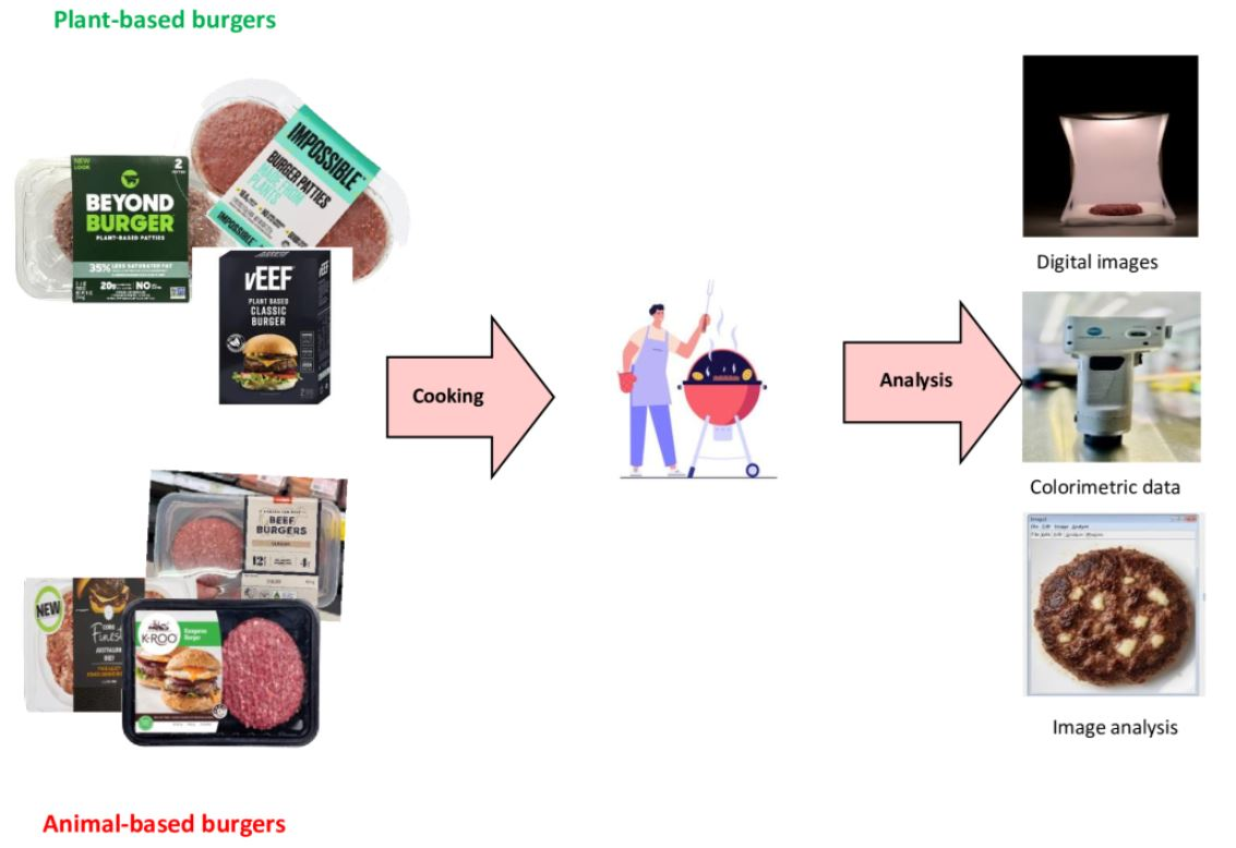 In the current study, varying endpoint internal temperatures were investigated in terms of how they influence the external and cross-sectional colour dispersion of commercially available PB and AB burgers. The main objectives involved setting up a processed imaging system and colour maps for both the external and internal view of burgers, with the aim of assessing the extent to which the current generation of PB burgers replicates the colour distribution of authentic animal-based burgers. This study will provide valuable insights into identifying the gaps that need to be addressed in the colour space to stimulate further research in developing high-quality meat analogues with authentic meat-like appearances using natural ingredients.