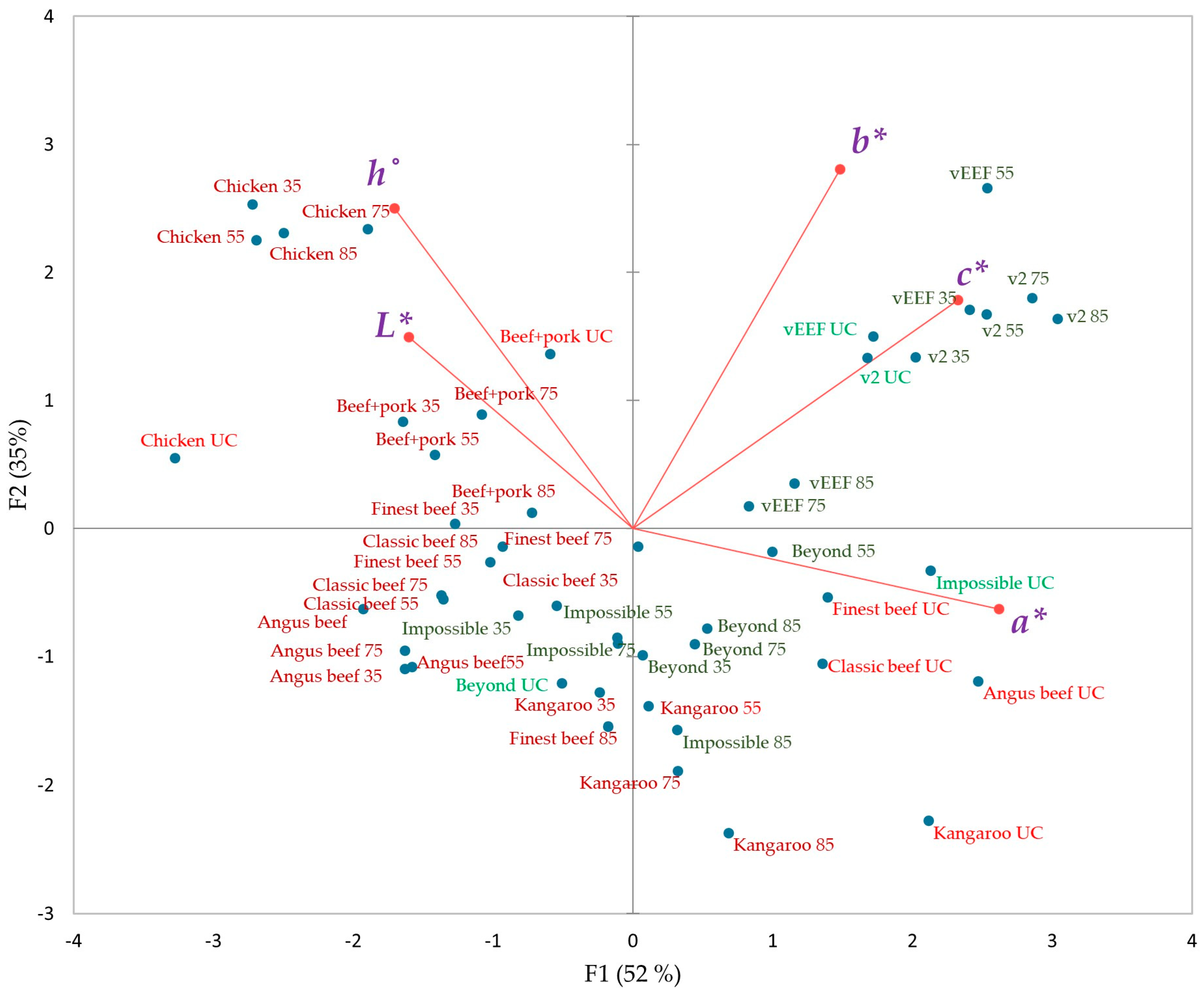 Figure 4. PCA biplot of internal colour coordinates of ten animal-based and plant-based burgers in five different endpoint internal temperatures (UC: uncooked; 35: 35 °C; 55: 55 °C; 75: 75 °C; 85; 85 °C) (PC1+PC2: 92%; p value < 0.0001) (light red signifies uncooked animal-based; dark-red signifies cooked animal-based; light- green signifies uncooked plant-based; dark green signifies cooked plant-based) (L*: lightness; a*: redness; b*: yellowness; c*: chroma, h°: hue).