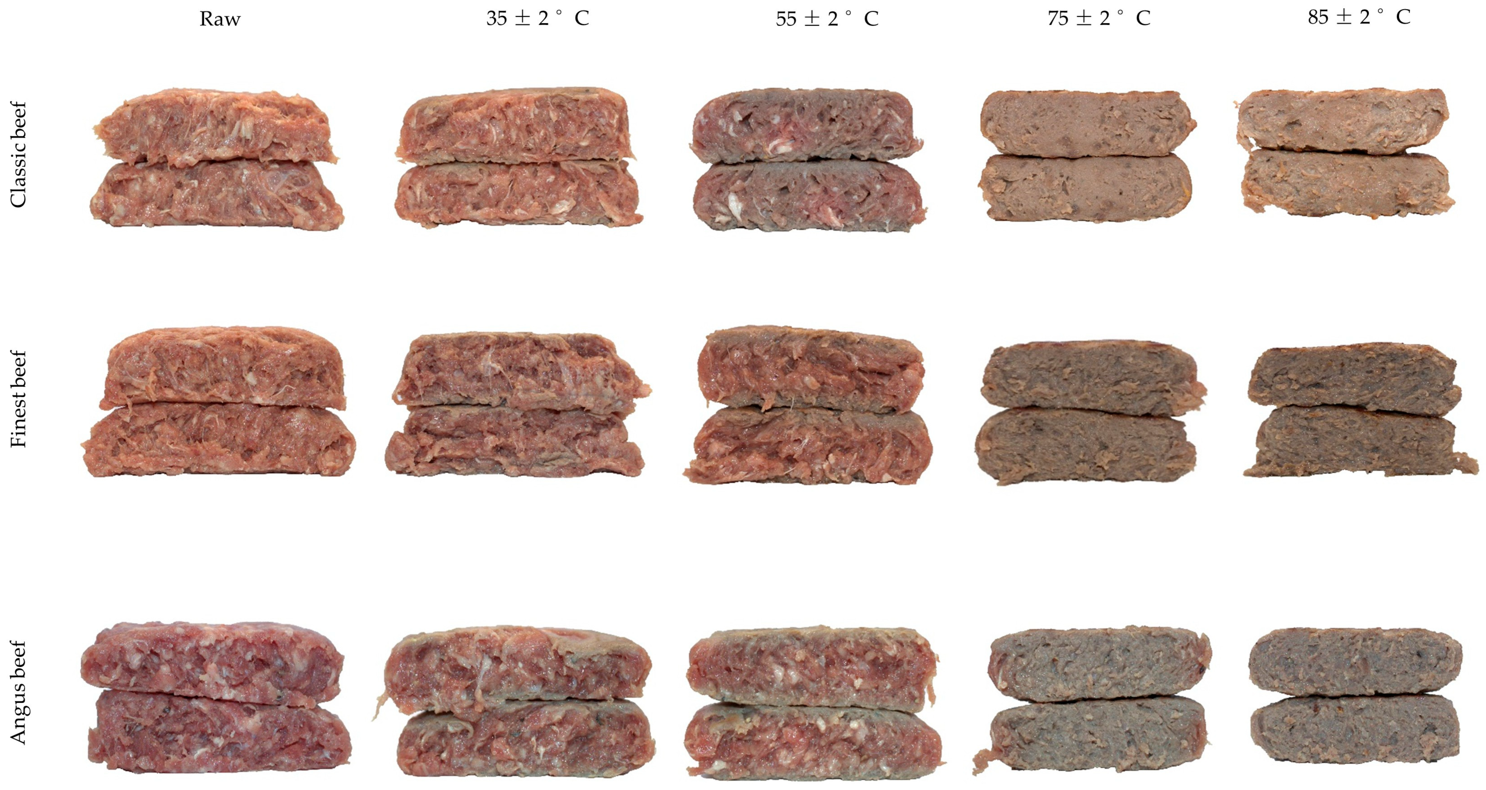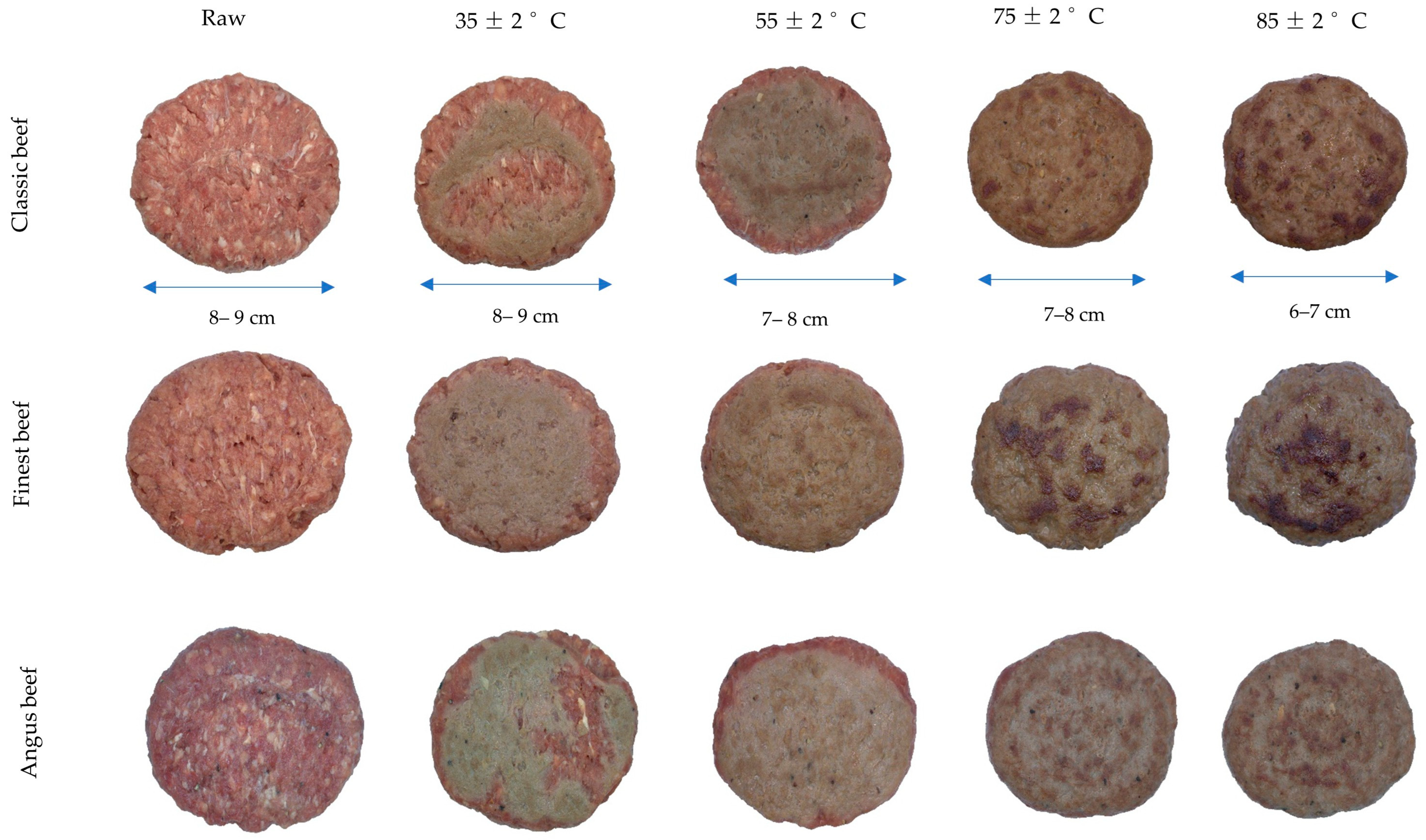 Ten commercially available AB (6 brands) and PB (4 brands) burgers were purchased as fresh chilled products from local supermarkets (Coles and Woolworths supermarkets in Brisbane, Australia) and controlled by the expiry date or batch number within a specific brand (Table 1). The samples were immediately stored (−19 °C) with their commercial packaging. When needed, the samples were thawed in a refrigerator (2 °C) for a duration of 24 h. An hour prior to cooking, the samples were removed to room temperature (22 °C). A Silex GTTPower save double grill (Silex Holdings Australia Pvt Ltd., Marrickville, NSW, Australia) was pre-heated, following which both PB and AB burgers were cooked at a plate temperature of 160 °C [18]. The cooking process continued until the internal temperature of the burger reached the set endpoint internal temperature of either 35 °C, 55 °C, 75 °C, or 85 °C, respectively. The internal temperature was measured using a digital thermometer inserted around 0.6 cm into the burger without contacting the hot grill surface (Single input thermometer w/recording—IC-FLUKE-53-2-B-50Hz, Fluke Corporation, Everett, WA, USA). All cooked samples were placed on unwrapped aluminium foil and allowed to cool for 5–10 min prior to photographing and further analysis.