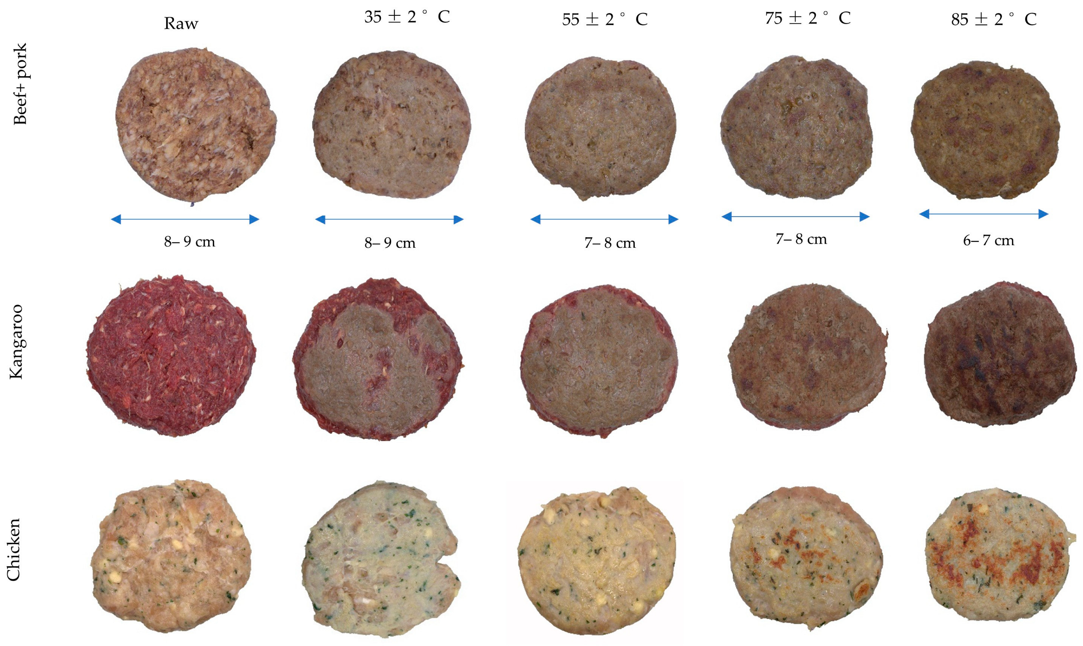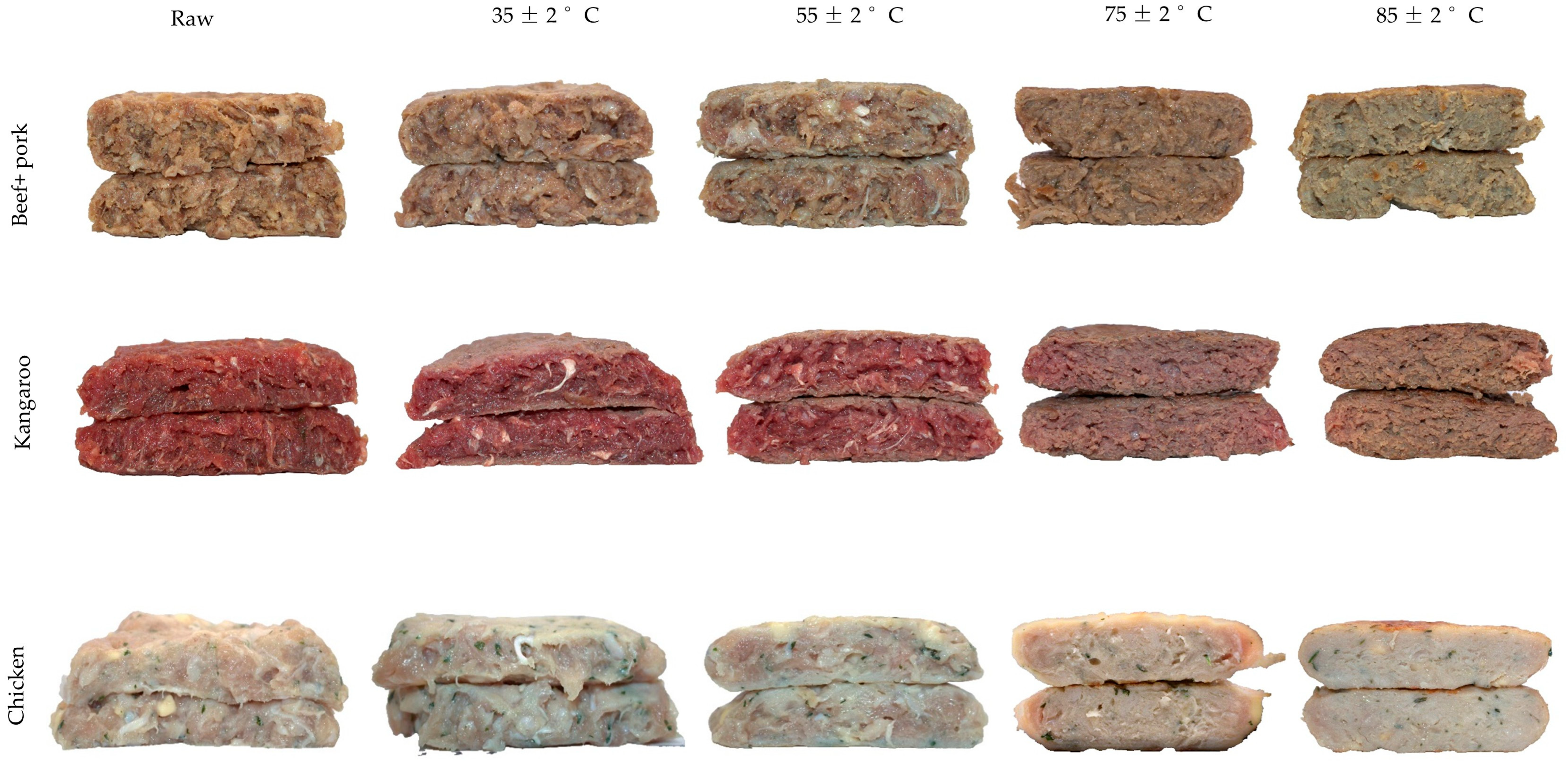As the internal cooking temperature increased, all beef-based burgers transitioned from the lower-right to the lower-left quadrant of the biplot (Figure 1). This transition is associated with the reduction in positive a* value, which is primarily attributed to the gradual degradation of myoglobin pigments and the Maillard reaction in AB burgers. At low internal temperatures (raw to 35 °C), myoglobin remains largely intact (oxymyoglobin or deoxymyoglobin), giving meat burgers a red to pink appearance (uneven browning). When the temperature reached “well-done” state at 75 °C, the presence of oxymyoglobin (Fe2+ bound to O2) and deoxymyoglobin (Fe2+ without O2) in the muscle is converted to metmyoglobin (Fe3+), which is brown [33]. Further heating leads to the formation of ferrihemochrome, a denatured heme-protein complex that contributes to the dull brown-grey colour in authentic meat burgers. Also, the Maillard reaction products between amino acids and reducing sugars at high internal temperatures facilitate the formation of melanoidins, which are brown pigments contributing to further brownish hue development of the burgers’ crust. [34,35,36]. Extensive protein denaturation and Maillard reaction occurrence, together with lipid oxidation and moisture loss, further intensify browning, which can be observed at 85 °C in meat burgers [34]. This gradual colour transition from red to brown and less lightness at increasing internal temperature in meat-based burgers could be observed in external visual images, and indeed it was strongly negatively correlated between a* and L* values (r = −0.967) at 75 °C internal temperature. Particularly, as shown in images, grey-brown colour development on the surface depends on the exposure to the surface of the grilling plate giving a mottled, inconsistent colouring especially evident at 35 °C for beef-based and kangaroo burgers (Figure 2). However, the lower myoglobin and different tissue structure in cooked chicken and beef+pork burgers remained in the same top-left cluster, with chicken burgers receiving significantly higher positive h° (+75 to +77) at higher internal temperatures [37].