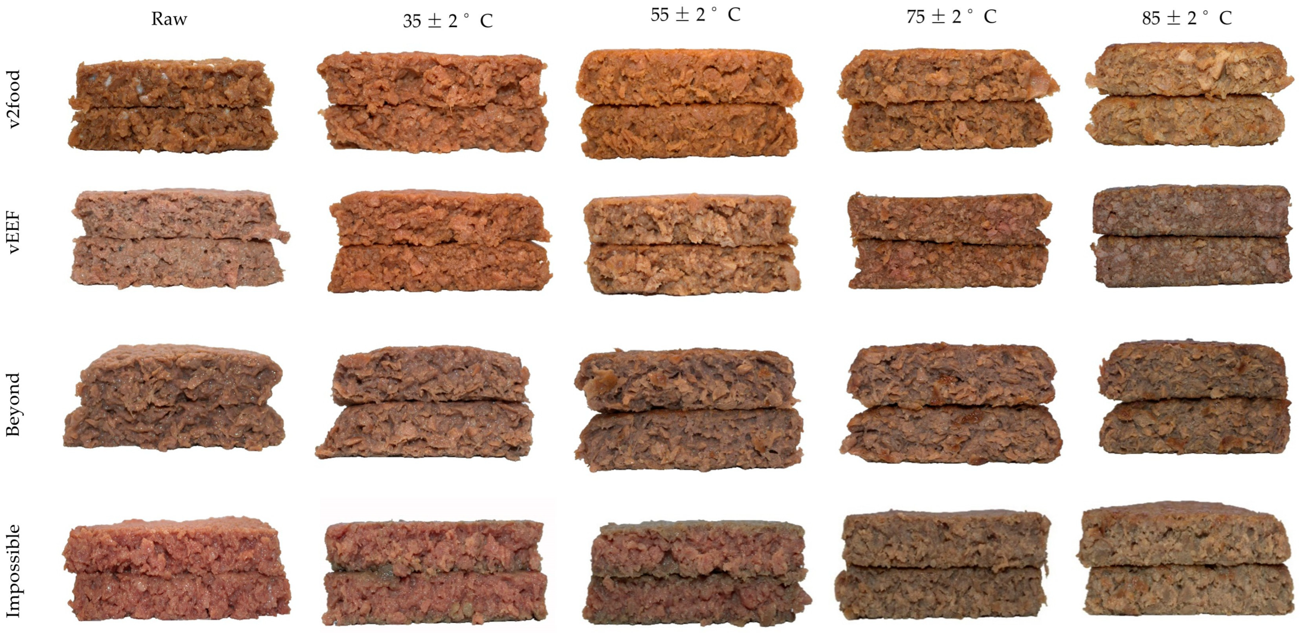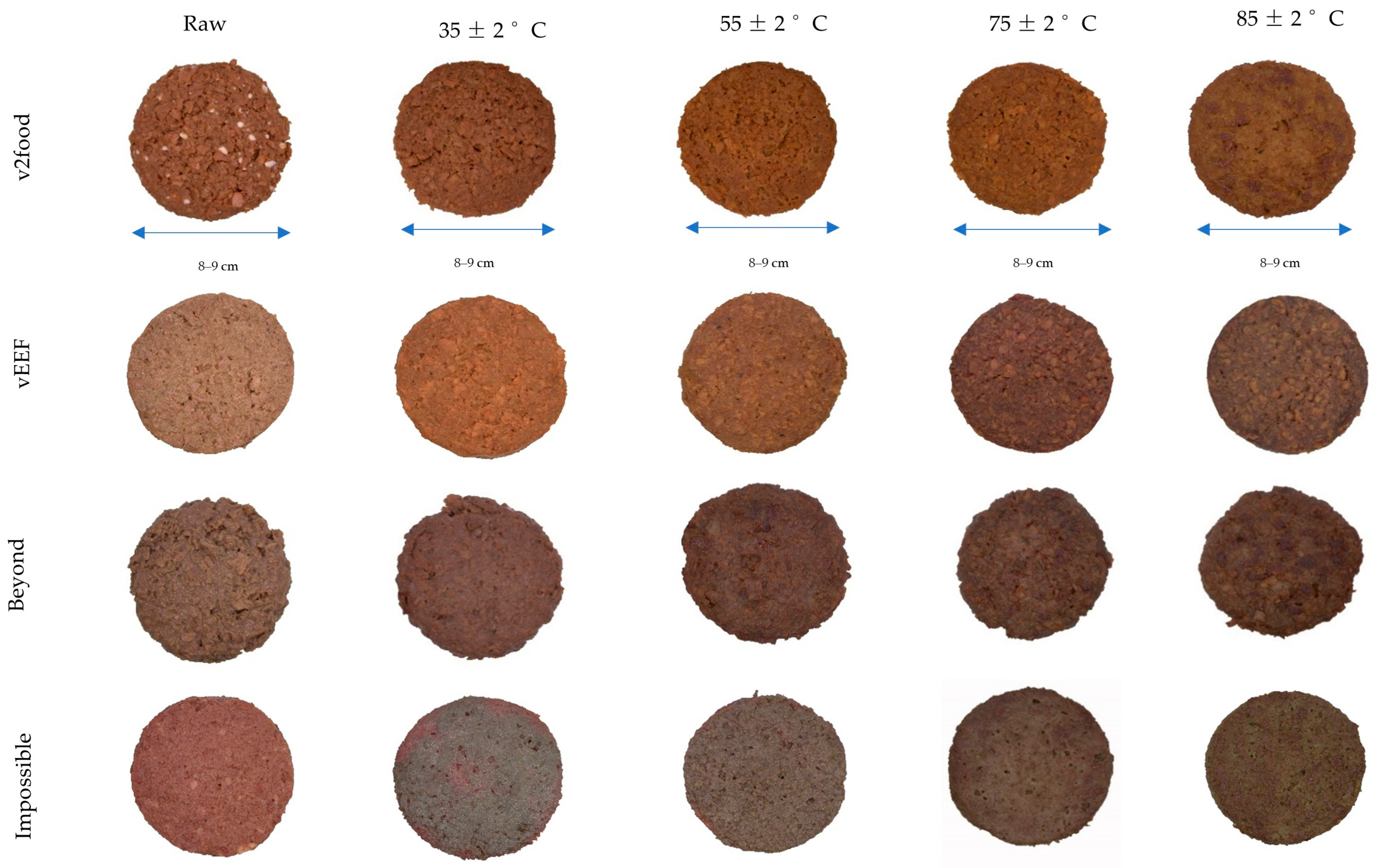 Figure 6. Internal colour transition of plant-based burgers at different internal temperatures (including the uncooked raw product for each sample).