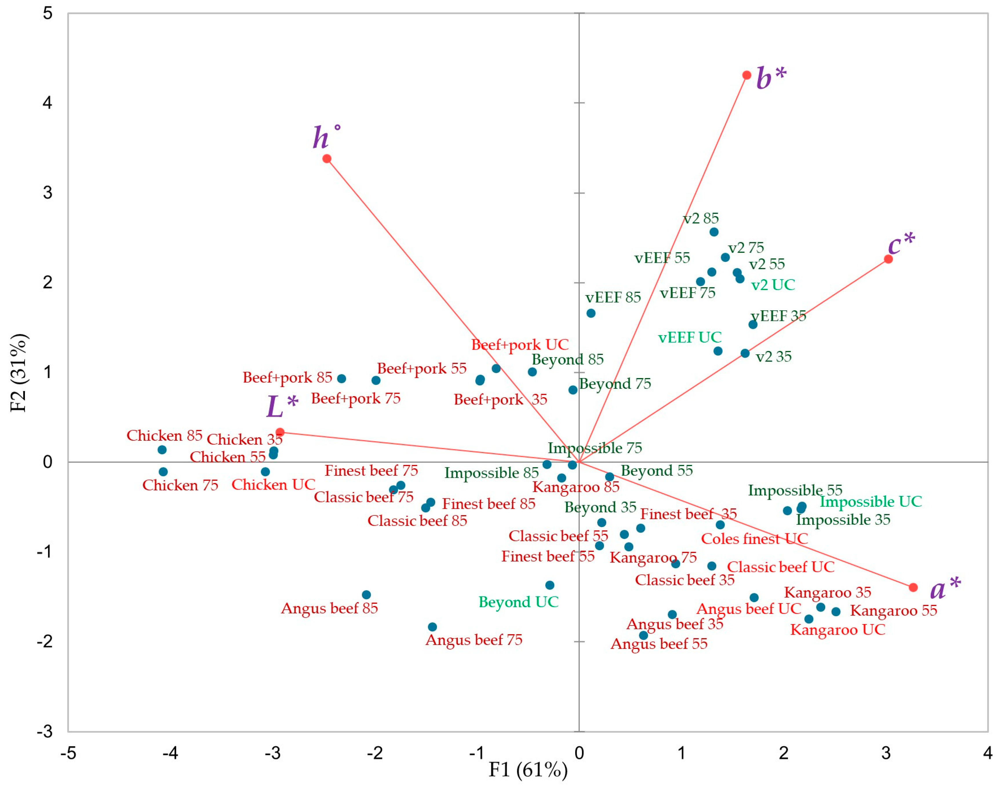 All uncooked beef-based and kangaroo burgers clustered in lower-right quadrant of the biplot (Figure 1), due to the significantly higher positive a* (+16 to +19), low positive L* (+45 to +49), and h° (+36 to +42) values compared to chicken, beef+pork, v2food, vEEF, and Beyond burgers in the colorimetric coordinates (Table S1). This is undoubtedly due to the initial high redness of raw beef and kangaroo burgers, which can be observed in visual images, attributed to their high myoglobin and low-fat content [27] (Figure 2). The significantly higher positive L* (+53 to +59), h° (+63 to +70), and lower positive a* (+5 to +9) in chicken and beef+pork burgers, mainly explained by the lower myoglobin content, resulted position in the left-top quadrant of the biplot (Figure 1) [28]. Confirming this, a strong negative correlation was observed between L* and a* (r = −0.792) among uncooked animal-based burgers.