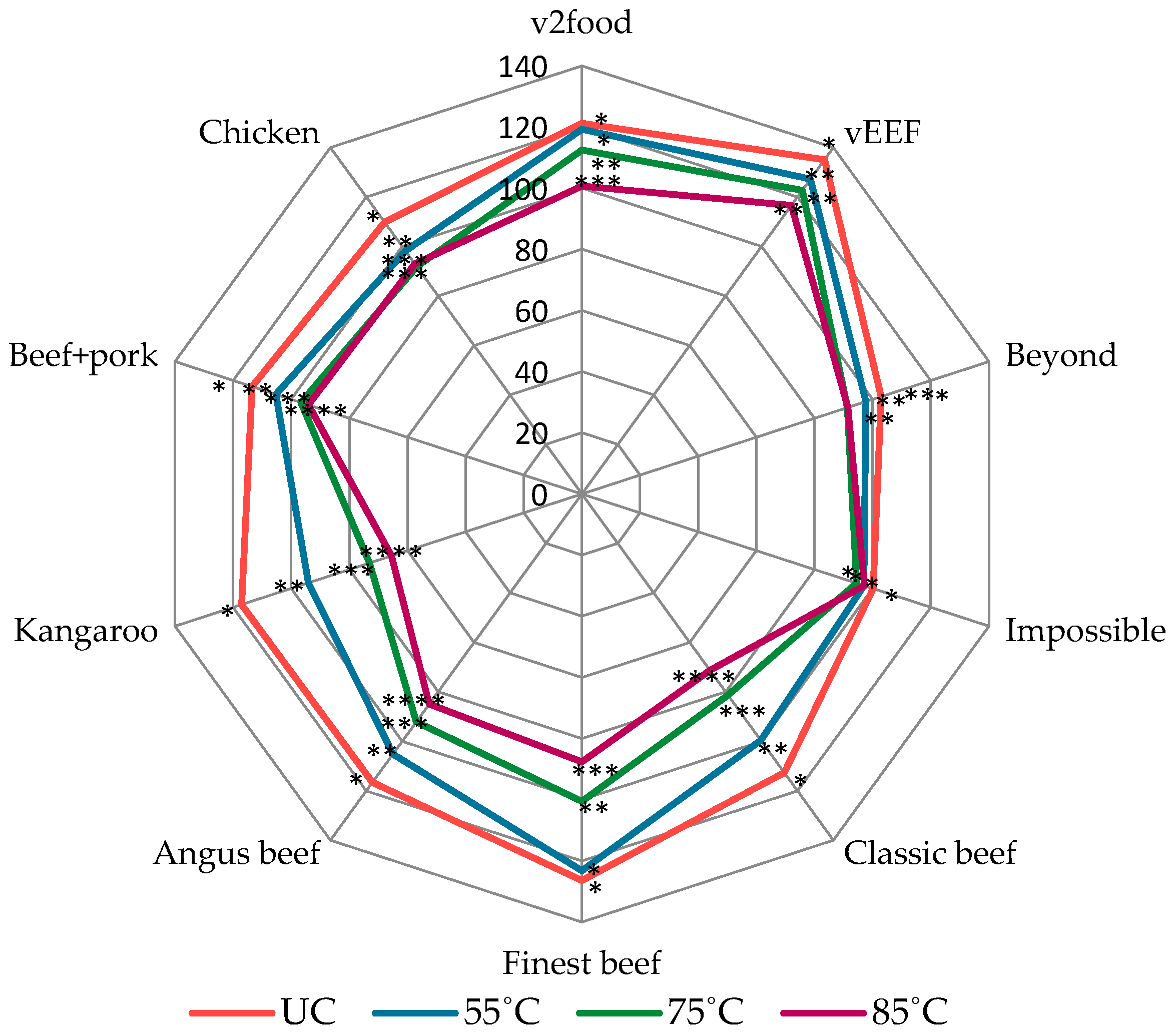 3.1. External Colour Transition of Burger Samples Across Five Different Internal Temperatures