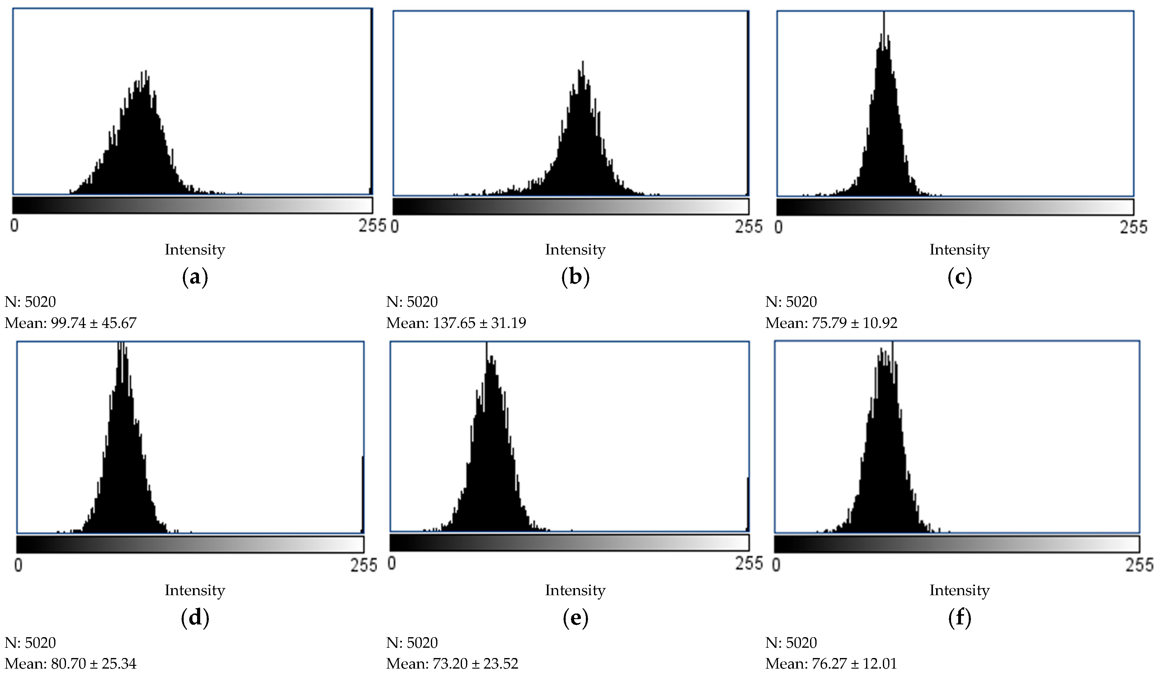 Figure 8. The degree of browning intensity quantified by determining the pixel density of processed images using Image J software (version 1.53t) (a) Coles Classic (beef); (b) Chicken; (c) v2food; (d) vEEF; (e) Beyond; (f) Impossible burger.