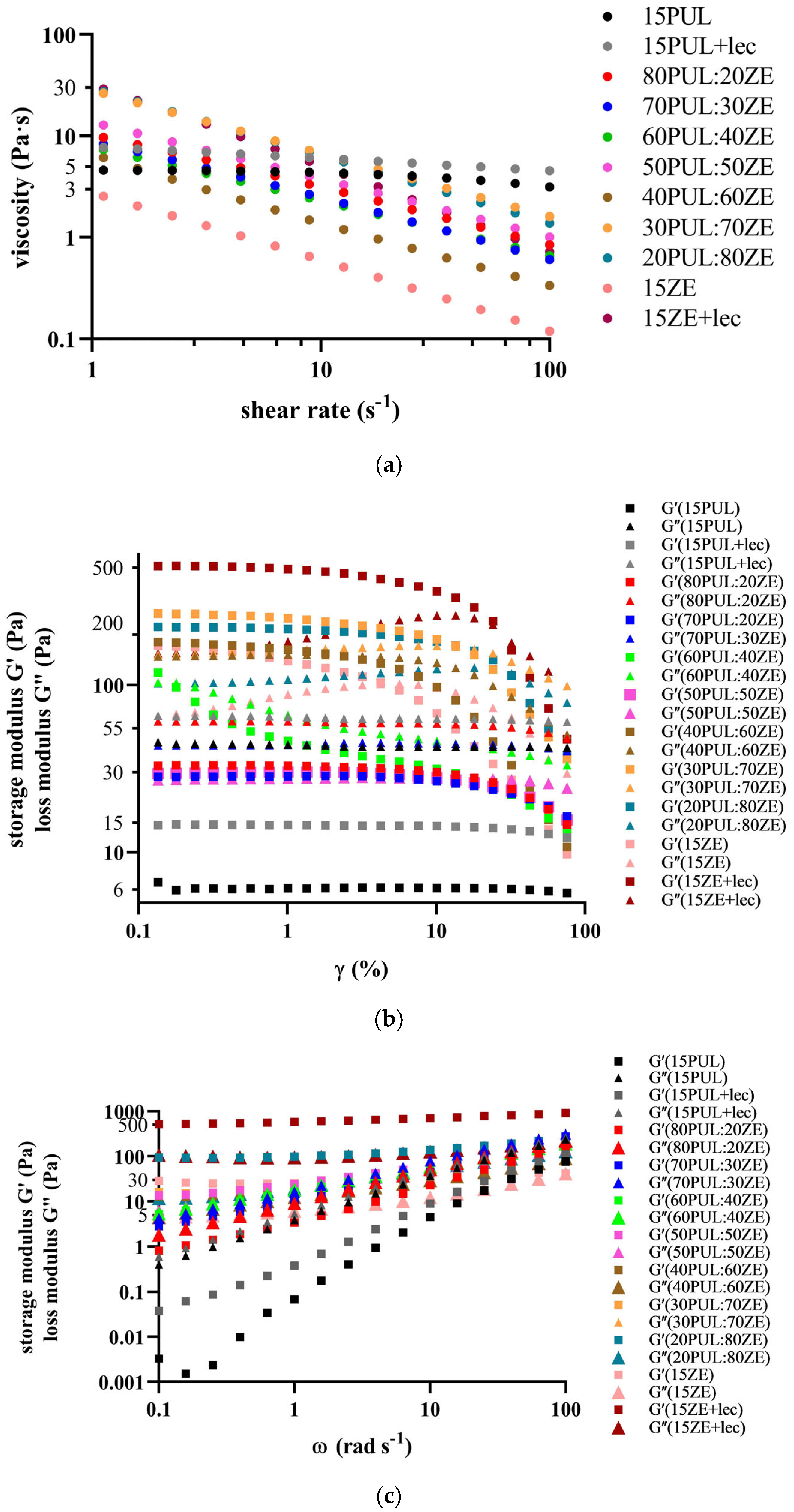 Viscosity curve determination was performed by a rotational test using a cone (1°)–plate measuring system (CP50), with the gap set at 0.102 mm. All samples were equilibrated at 25 °C for 3 min. The shear dependence of viscosity was measured in the range of 0.1–100 s−1.