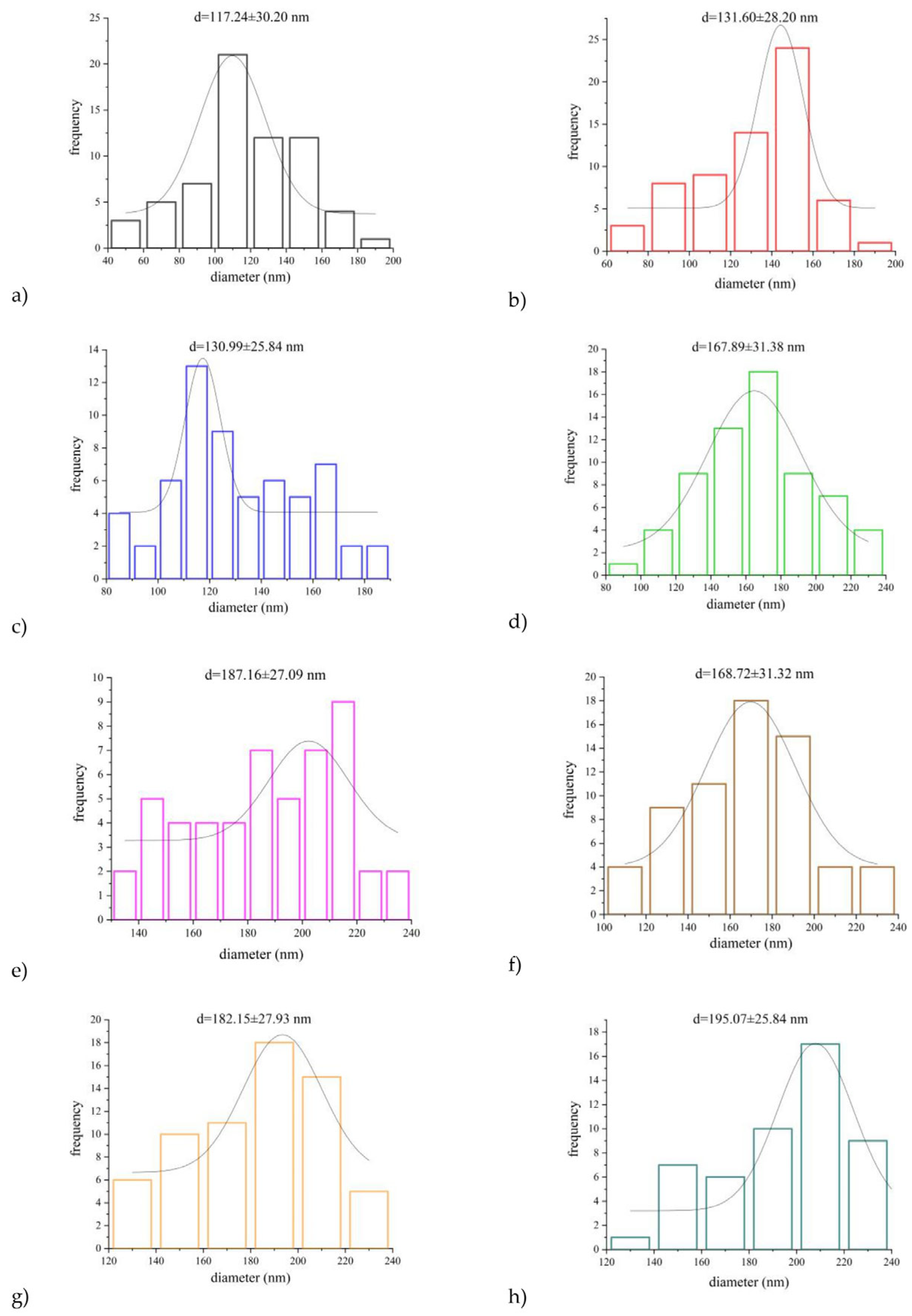 The relative distribution of the nanofibers’ diameter was evaluated by combining ImageJ 1.53 software for the analysis of SEM micrographs to determine nanofibers’ diameter, and Origin Pro 8.0 software for graphing and data analysis of the measured diameters (OriginLab Corporation, Northampton, MA, USA). Gaussian fit was applied for the peak of each histogram.