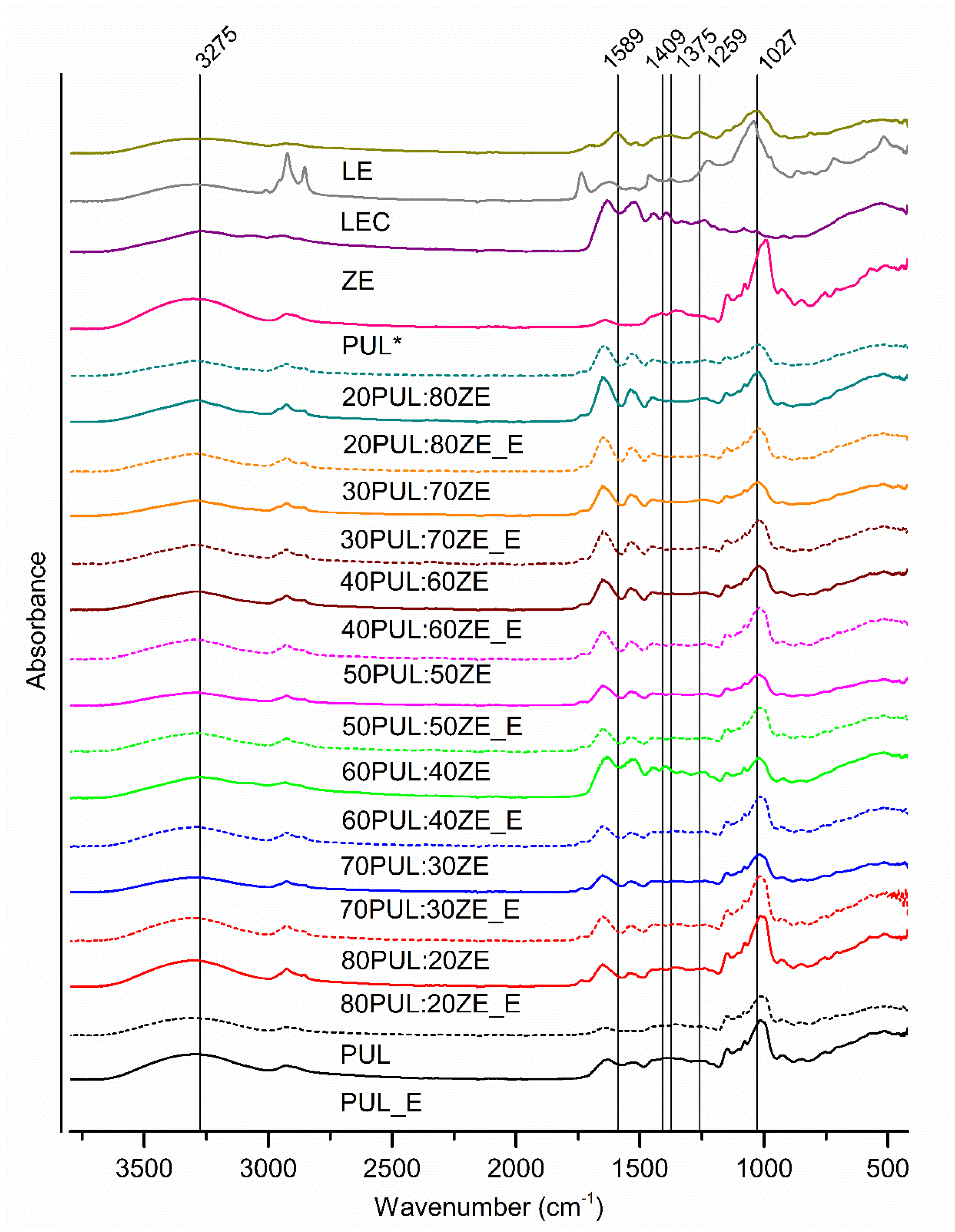LEC, sunflower lecithin; LE, lyophilized, non-encapsulated extract; PUL*, pullulan; ZE*, zein; samples without „_E”, nanofibers without extract; samples marked with „_E”, nanofibers with extract.
