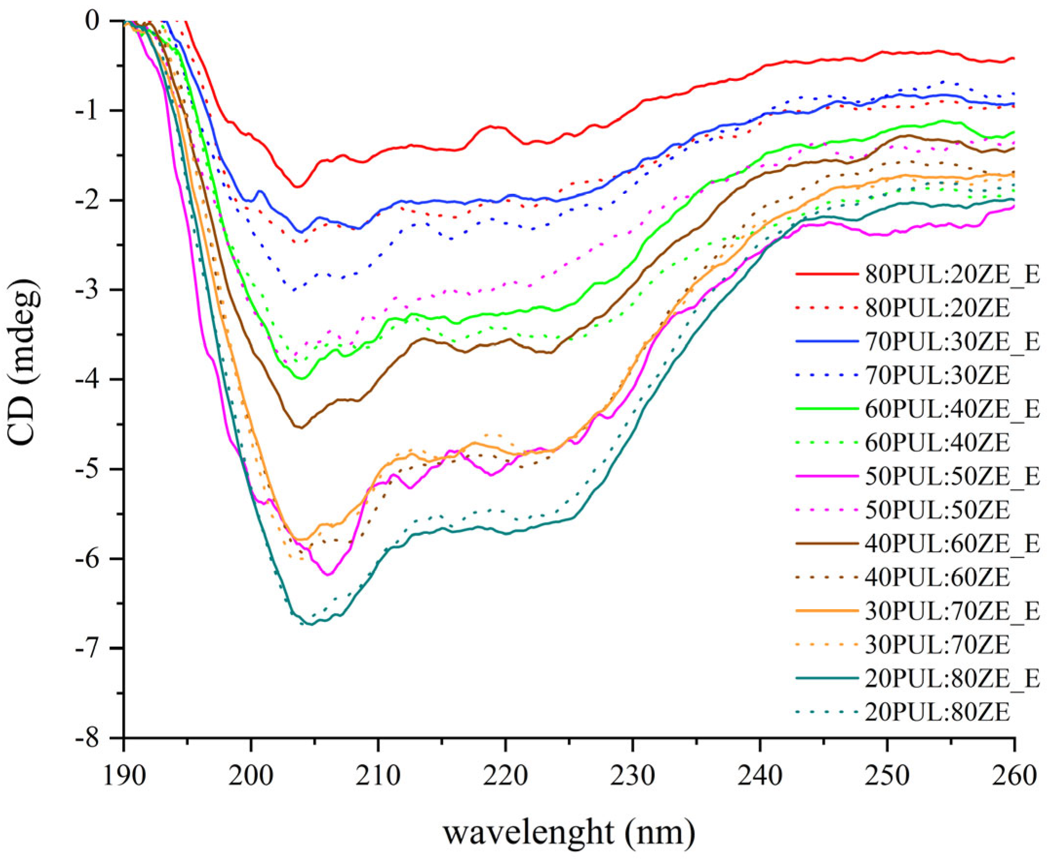 Figure 8. CD spectra of formulated PUL:ZE nanofibers. Samples without „_E”, nanofibers without extract; samples marked with „_E, nanofibers with extract.