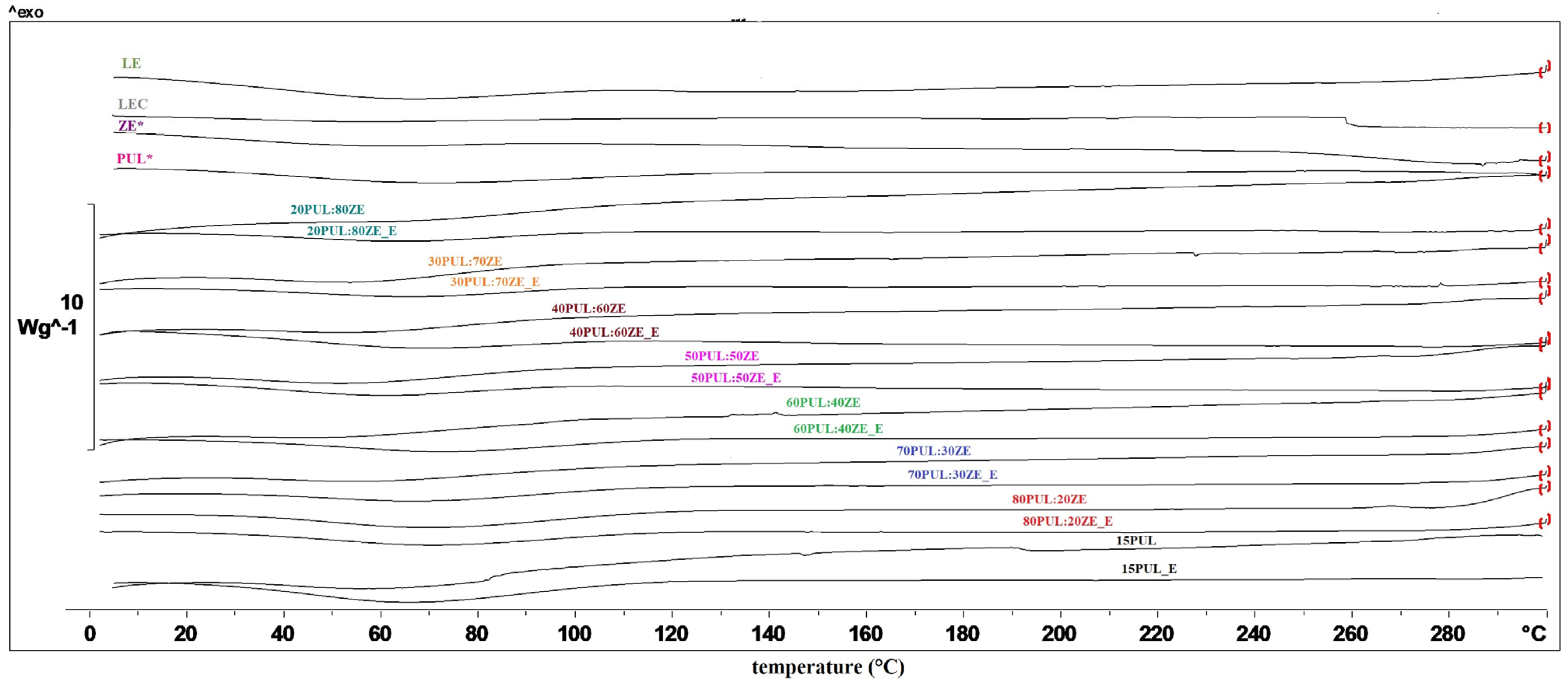 Figure 9. DSC thermograms of formulated PUL:ZE nanofibers. LEC, sunflower lecithin; LE, lyophilized, non-encapsulated extract; PUL*, pullulan; ZE*, zein; samples without „_E”, nanofibers without extract; samples marked with „_E”, nanofibers with extract.