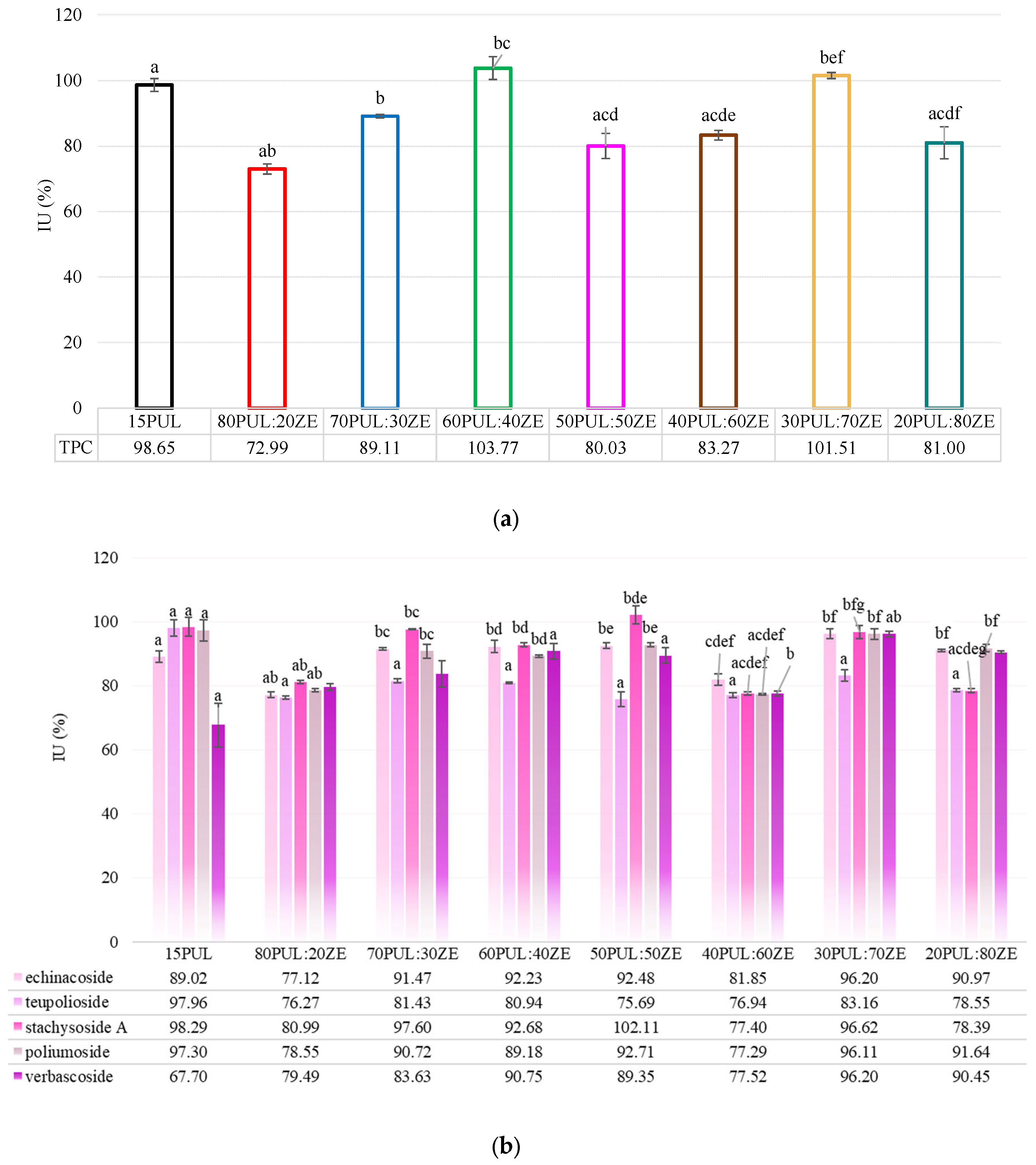 Figure 10. (a,b) Encapsulation efficiency (%) of total phenolic content and phenylethanoid glycosides (echinacoside, teupolioside, stachysoside A, poliumoside and verbascoside) in nanofiber formulations. Values marked with the same letter are statistically significant (p < 0.05).
