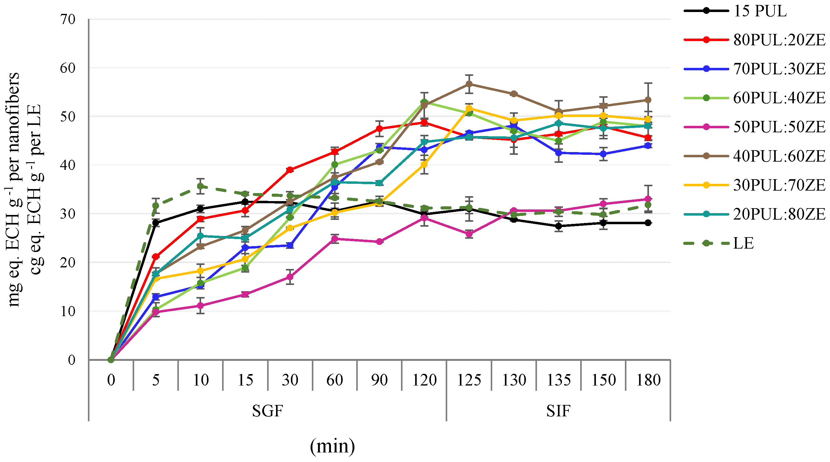 Figure 12. Kinetic release of total phenolic content in simulated in vitro gastrointestinal conditions from nanofiber delivery systems. LE, lyophilized extract.