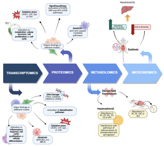 Abbreviations: ACC: Acetyl-CoA Carboxylase; ACCA: Acetyl-CoA Carboxylase A; ACLY: ATP Citrate Lyase; AFP: Alpha Fetoprotein; AHR: Aryl Hydrocarbon Receptor; ALDH1A2: Aldehyde dehydrogenase 1 family, member A2; ALDH3A1: Aldehyde Dehydrogenase 3 Family 1; APAF1: Apoptotic peptidase activating factor 1; APOB: Apolipoprotein B; ATF4: Activating Transcription Factor 4; ATF6: Activating Transcription Factor 6; BAK1: BCL2-antagonist/killer 1; BAX: BCL2-Associated X Protein; BBC3: BCL2-Binding Component 3; BCL2: B-cell CLL/lymphoma 2; BCL2L1: BCL2-like 1; BID: BH3 interacting domain death agonist; BIP: Binding Immunoglobulin Protein; BRCA2: Breast cancer 2, early onset; c-Jun: Jun proto-oncogene; CASP3: Caspase 3, apoptosis-related cysteine peptidase; CASP7: Caspase 7, apoptosis-related cysteine peptidase; CASP8: Caspase 8, apoptosis-related cysteine peptidase; CASP9: Caspase 9, apoptosis-related cysteine peptidase; CAT: Catalase; CCND1: Cyclin D1; CCNE2: Cyclin E2; CCNG1: Cyclin G1; CDK7: Cyclin-dependent kinase 7; CDKN1A: Cyclin-Dependent Kinase Inhibitor 1A; CDKN2B: Cyclin-dependent kinase inhibitor 2B; CDKN2C: Cyclin-dependent kinase inhibitor 2C; CES1: Carboxylesterase 1; CES2: Carboxylesterase 2; CHEK1: Checkpoint kinase 1; CPT1A: Carnitine Palmitoyltransferase 1A; CX32: Gap Junction Protein Beta; 1CX3CR: CX3C Chemokine Receptor; CYP1A: cytochrome P450, family 1, subfamily A; CYP1A1: cytochrome P450, family 1, subfamily A, polypeptide 1; CYP1A2: cytochrome P450, family 1, subfamily A, polypeptide 2; CYP1B1: Cytochrome P450, family 1, subfamily B, polypeptide 1; CYP26: Cytochrome P450 26; CYP2A13: Cytochrome P450, family 2, subfamily A, polypeptide 6; CYP2A6: Cytochrome P450, family 2, subfamily A, polypeptide 6; CYP2F1: Cytochrome P450, family 2, subfamily F, polypeptide 1; CYP3A4: cytochrome P450 family 3 subfamily A member 4; CYP3A43: Cytochrome P450, family 3, subfamily A, polypeptide 43; CYP3A7: Cytochrome P450, family 3, subfamily A, polypeptide 7; DDIT3: DNA-damage-inducible transcript 3; DGAT1: Diacylglycerol Acyltransferase 1; DGAT2: Diacylglycerol Acyltransferase 2; DIABLO: Diablo, IAP-binding mitochondrial protein; E2F4: E2F transcription factor 4, p107/p130-binding; eIF2a: Eukaryotic Translation Initiation Factor 2 alpha; EPHX1: Epoxide Hydrolase 1; ERCC4: Excision repair cross-complementing rodent repair deficiency, complementation group 4; FABP1: Fatty Acid Binding Protein 1; Fabp4: Fatty Acid Binding Protein 4; FAS: Fas (TNF receptor superfamily, member 6); FASN: Fatty Acid Synthase; FAT/CD36: Fatty Acid Translocase/Cluster of Differentiation 36; FGF-23: Fibroblast Growth Factor 23; FOS: FBJ murine osteosarcoma viral oncogene homolog; FOSB: FBJ murine osteosarcoma viral oncogene homolog B; FOXA2: Forkhead box A2; FOXO3: Forkhead box O3; GAB1: GRB2-associated binding protein 1; GADD45A: Growth arrest and DNA-damage-inducible, Alpha; GADD45B: Growth arrest and DNA-damage-inducible, Beta; GCLC: Glutamate-cysteine ligase, catalytic subunit; GDF15: growth differentiation factor 15; GNMT: Glycine N-methyltransferase; GPx: Glutathione Peroxidase; GR: Glutathione reductase; GST: Glutathione S-Transferase; GSTA1: glutathione S-transferase alpha 1; GSTA2: Glutathione S-transferase alpha 2; GSTM2: Glutathione S-transferase mu 2 (muscle); GSTM3: Glutathione S-transferase mu 3 (brain); H1F1A: Hypoxia Inducible Factor 1 Alpha; HSPA5: Heat Shock Protein Family A (Hsp70) Member 5; HUS1: HUS1 checkpoint homolog (S. pombe); IL-6: Interleukin 6; IRE1a: Inositol-Requiring Enzyme 1 alpha; JUN: Jun proto-oncogene; JUNB: Jun B proto-oncogene; Klkb1: Kallikrein B1; LIG4: Ligase IV, DNA, ATP-dependent; MAPK: Mitogen-Activated Protein Kinase; MCL1: Myeloid cell leukemia sequence 1 (BCL2-related); MDM2: Human homologue of mouse double minute 2; MK167: Marker of Ki-67; MRE11A: MRE11 meiotic recombination 11 homolog A (S. cerevisiae); MSH3: mutS homolog 3 (E. coli); MYC: v-myc avian myelocytomatosis viral oncogene homolog; NAC: N-Acetyl Cysteine; NAFLD: Non-Alcoholic Fatty Liver Disease; NAT1: N-acetyltransferase 1 (arylamine N-acetyltransferase); NAT2: N-Acetyltransferase 2; NFKB1: Nuclear factor of kappa light polypeptide gene enhancer in B-cells 1; Nrf2: Nuclear factor erythroid 2-related factor 2; Nupr1: Nuclear Protein 1; P53: Tumor protein p53; PCNA: Proliferating cell nuclear antigen; PLA2: Phospholipase A2; POLB: Polymerase (DNA directed), Beta; PPAR-α: Peroxisome Proliferator-Activated Receptor alpha; PPARa: Peroxisome Proliferator-Activated Receptor alpha; PPM1: Protein Phosphatase 1; PPP6C: Protein Phosphatase 6 Catalytic Subunit; PROC: Protein C; RAD1: RAD1 homolog (S. pombe); RAD51: RAD51 homolog (S. cerevisiae); Rad51: RAD51 Recombinase; RPL6: Ribosomal Protein L6; SCD1: Stearoyl-CoA Desaturase 1; SREBF1: Sterol Regulatory Element-Binding Transcription Factor 1; SREPB1: Sterol Regulatory Element Binding Protein 1; SULT1A1: Sulfotransferase family, cytosolic, 1A, phenol-preferring, member 1; SULT1B1: Sulfotransferase Family 1 B Member 1; SULT1B1: Sulfotransferase Family 1 B Member 1; SULT1C2: Sulfotransferase Family 1 C Member 2; TFDP1:Transcription factor Dp-1; TGFB1: Transforming Growth Factor Beta 1; TGFB2 Transforming growth factor. beta 2; Thbs1: Thrombospondin 1; Thpo: Thrombopoietin; TIMP1: TIMP metallopeptidase inhibitor 1; TIMP2: Tissue Inhibitor of Metalloproteinase 2; TNF: Tumor necrosis fator; TNFAIP3: Tumor necrosis factor. alpha-induced protein 3; TNFAIP8: TNF Alpha Induced Protein 8; TNFRSF1A-associated via death domain; TNFRSF10A: Tumor necrosis factor receptor superfamily. member 10a; TOP2α: Topoisomerase II Alpha; TRADD: TNFRSF1A-associated via death domain; TTR: Transthyretin; TXNRD1: Thioredoxin reductase 1; UGT1: UDP glucuronosyltransferase 1 family. polypeptide A6; UGT1A1: UDP glucuronosyltransferase 1 family. polypeptide A1; UGT2B7: UDP Glucuronosyltransferase 2B7; UHRF1: Ubiquitin-like with PHD and ring finger domains 1; XPC: Xeroderma pigmentosum. complementation g