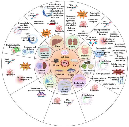Overall, transcriptomic studies highlight the liver as a primary target of CYN toxicity, affecting detoxification pathways, DNA damage response, lipid metabolism, and oxidative stress. Moreover, analyses indicate that CYN can disrupt hepatic differentiation, modulate phase I and II enzyme expression, and alter genes associated with NAFLD.