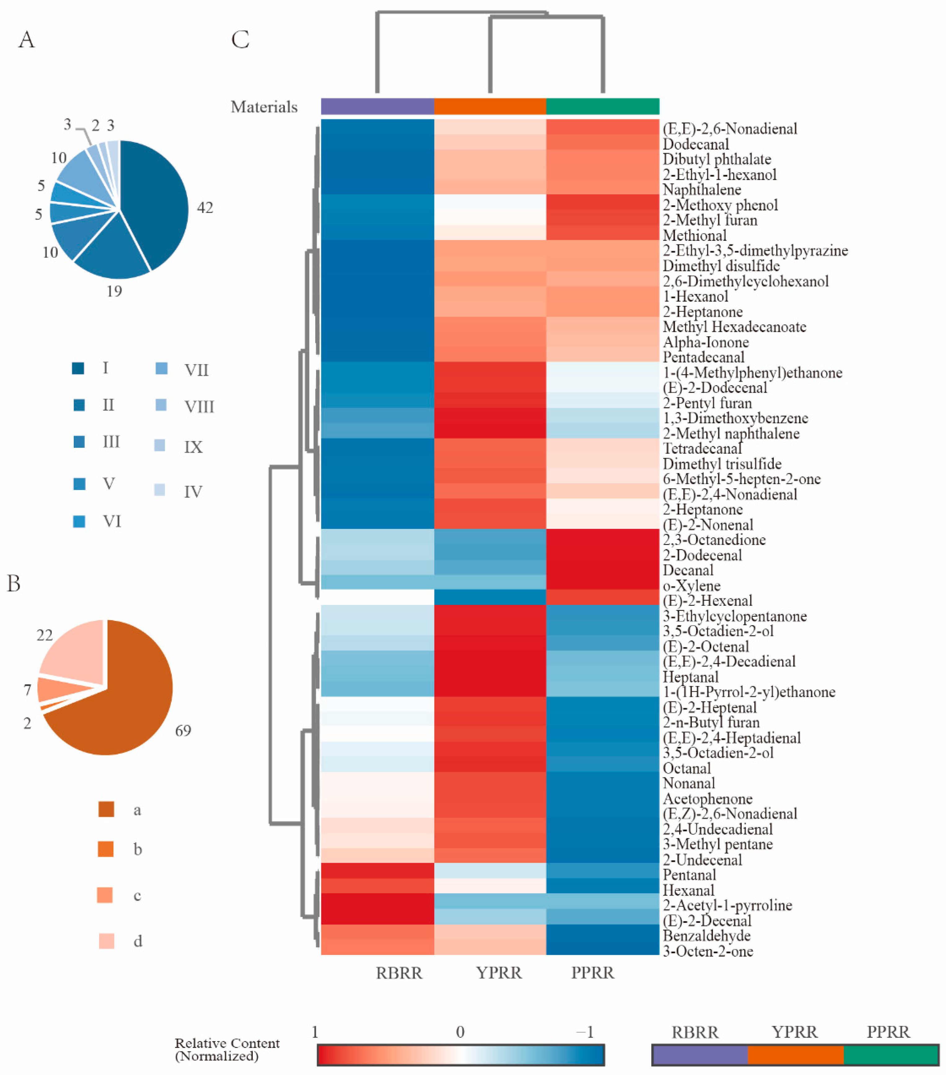3.2.3. Analyses of the OAVs and Aroma Characteristics of Different Varieties