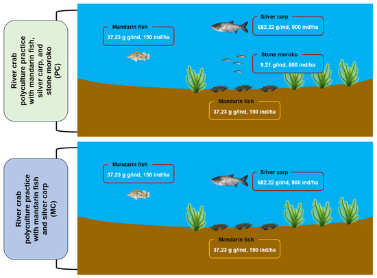 The study was conducted at Changcheng River Crab Farm (119.82° E, 31.99° N) in Changzhou, Jiangsu Province, China (119.82° E, 31.99° N), utilizing two standardized 0.87-ha aquaculture ponds from 15 March to 15 October 2023, to compare two polyculture practices for Chinese mitten crab (Eriocheir sinensis) (Figure 1). The first polyculture practice (MC) involved co-culturing Chinese mitten crab with mandarin fish (Siniperca chuatsi) and silver carp (Hypophthalmichthys molitrix), while the second polyculture practice (PC) introduced an additional species, stone moroko (Pseudorasbora parva) (Figure 1). The initial stocking densities and average weights for various species were as follows: per hectare, 21,000 Chinese mitten crabs averaging 15.63 g each, 150 mandarin fish averaging 37.23 g each, 900 silver carps averaging 682.22 g each, and 800 stone moroko averaging 9.21 g each. All polyculture practices received daily feed comprising commercial pellets (Xinbei Menghe Hongzhiyu Aquaculture Farm, Changzhou, China), ice-fresh fish, and corn in a 1:7:2 ratio, administered at 3% of estimated crab biomass with weekly quantity adjustments. Water management involved biweekly exchanges replacing 20% of pond volume, maintaining consistent operational protocols between different polyculture practices.