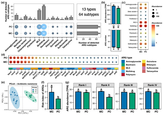 Characteristics of the antibiotics resistance genes (ARGs) in pond sediment. (a) Numbers of the detected ARG types and subtypes in pond sediment samples. (b) Differences in the number and abundance of the sediment ARGs between PC and MC groups. (c) Differences in the abundances of the ARG types in pond sediment between PC and MC groups. (d) Differences in the abundances of the dominant ARG subtypes (top 30 by relative abundance) in pond sediment between PC and MC groups. (e) Principal co-ordinates analysis (PCoA) based on Bray–Curtis distances revealing the difference in the ARGs profiles between PC and MC groups. (f) Differences in the risk index of ARGs in pond sediment between the PC and MC groups. (g) Differences in the abundances of ARGs ranked into four levels based on their potential threat to human health between the PC and MC groups. Significant differences (p < 0.05) are indicated by non-matching superscript letters throughout.