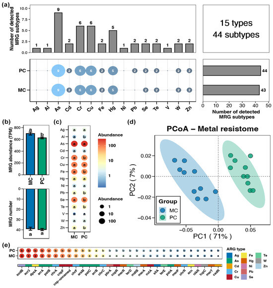 Characteristics of the metal resistance genes (MRGs) in pond sediment. (a) Numbers of the detected MRG types and subtypes in the pond sediment samples. (b) Differences in the number and abundance of the sediment MRGs between the PC and MC groups. (c) Differences in the abundances of the MRG types in pond sediment between the PC and MC groups. (d) Principal co-ordinates analysis (PCoA) based on Bray–Curtis distances revealing the difference in the MRGs profiles between the PC and MC groups. (e) Differences in the abundances of the dominant MRG subtypes (top 30 by relative abundance) in pond sediment between the PC and MC groups. Significant differences (p < 0.05) are indicated by non-matching superscript letters throughout.