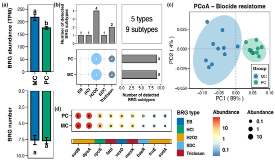 Characteristics of the biocide resistance genes (BRGs) in pond sediment. (a) Differences in the number and abundance of the sediment BRGs between the PC and MC groups. (b) Numbers of the detected BRG types and subtypes in the pond sediment samples. (c) Principal co-ordinates analysis (PCoA) based on Bray–Curtis distances revealing the difference in the BRGs profiles between the PC and MC groups. (d) Differences in the abundances of the MRG subtypes in pond sediment between the PC and MC groups. Significant differences (p < 0.05) are indicated by non-matching superscript letters throughout.