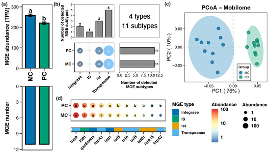 Characteristics of the mobile genetic elements (MGEs) in pond sediment. (a) Differences in the number and abundance of the sediment MGEs between the PC and MC groups. (b) Numbers of the detected MGE types and subtypes in pond sediment samples. (c) Principal co-ordinates analysis (PCoA) based on Bray–Curtis distances revealing the difference in the MGEs profiles between the PC and MC groups. (d) Differences in the abundances of the MGE subtypes in pond sediment between the PC and MC groups. Significant differences (p < 0.05) are indicated by non-matching superscript letters throughout.
