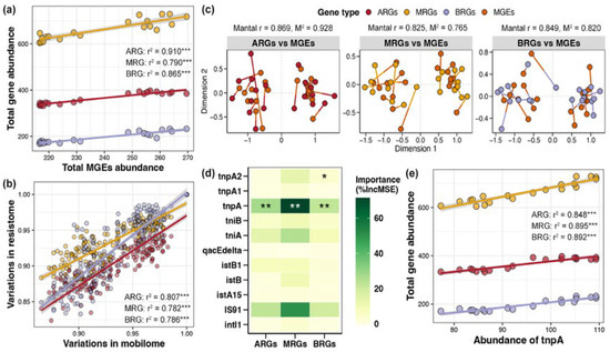 Linear regression revealed obvious linear relationships between the total abundance of MGEs in the pond sediment and the total abundances of ARGs, MRGs, and BRGs, respectively, with the association strength ranking as ARG (r2 = 0.910) > BRG (r2 = 0.865) > MRG (r2 = 0.790) (Figure 6a, p < 0.05). Simultaneously, based on the Bray–Curtis distance, there were significant distance-dependent similarities between the composition of MGEs and the compositions of ARGs, MRGs, and BRGs, respectively, with the association strength ranking as ARG (r2 = 0.807) > BRG (r2 = 0.786) > MRG (r2 = 0.782) (Figure 6b, p < 0.05). Mantel tests and Procrustes analysis further indicated remarkable associations between the composition of MGEs and the compositions of ARGs, MRGs, and BRGs, respectively, again with the association strength ARG (r2 = 0.869) > BRG (r2 = 0.849) > MRG (r2 = 0.825) (Figure 6c, p < 0.05). Random forest analysis identified the key MGE markedly influencing the ARGs, MRGs, and BRGs as gene tnpA, which could be used as an indicator gene to gauge the total abundance of ARGs, MRGs, and BRGs in pond sediment (Figure 6d, p < 0.05). Further linear regression evaluated the considerable correlations of tnpA gene abundance with the total abundances of ARGs, MRGs, and BRGs, respectively (Figure 6e, p < 0.05).