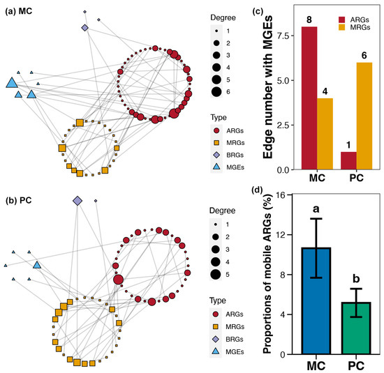 Co-occurrence networks for the sediment resistome in different polyculture practices. (a) Co-occurrence networks for the antibiotic resistance genes (ARGs), metal resistance genes (MRGs), biocide resistance genes (BRGs), and mobile genetic elements (MGEs) within pond sediment in the MC group. (b) Co-occurrence networks for the ARGs, MRGs, BRGs, and MGEs within pond sediment in the PC group. (c) Differences in the number of edges between MEGs and ARGs or MRGs across the PC and MC groups. (d) Difference in the proportions of mobile ARGs in pond sediment between the PC and MC groups. Significant differences (p < 0.05) are indicated by non-matching superscript letters throughout.
