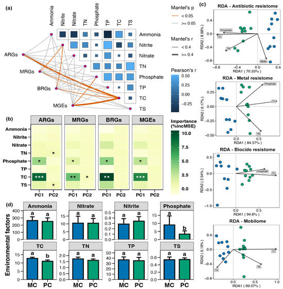 The Mantel test indicated that the ARGs, MRGs, BRGs, and MGEs in pond sediment were considerably correlated with the TC level, and both MRGs and BRGs were also significantly correlated with the nitrite content (Figure 8a, p < 0.05). Random forest analysis suggested that the TC, TN, TS, and phosphate contents were likely key factors driving the variations in sediment resistome (Figure 8b, p < 0.05). RDA analysis demonstrated that in pond sediment, both ARGs and MRGs were substantially correlated with the TC, TN, and phosphate levels, whereas BRGs were remarkably correlated with the TC and phosphate content (Figure 8c, p < 0.05). MGEs were significantly correlated with the TC, TN, and TS contents (Figure 8c, p < 0.05). The TC and phosphate concentrations in pond sediment were significantly decreased in the PC group compared with the MC group (Supplementary Materials, Figure 8d, Wilcoxon rank-sum test, p < 0.05).