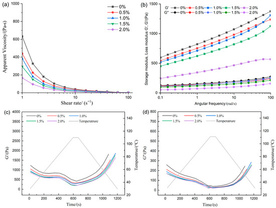 The effect of ERG addition on rheological properties. (a) Apparent viscosity. (b) Frequency sweep. (c,d) Temperature sweep.
