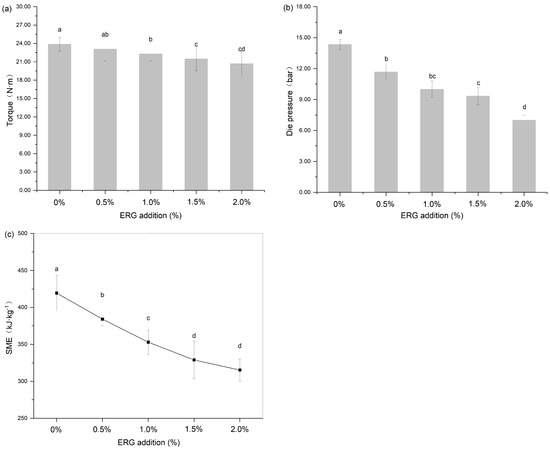 The effect of ERG addition on extrusion response parameters: (a) torque (N·m), (b) die pressure (bar) and (c) specific mechanical energy (SME). Different letters indicate significantly different (p < 0.05) as determined by one-way ANOVA with Tukey’s post hoc test.