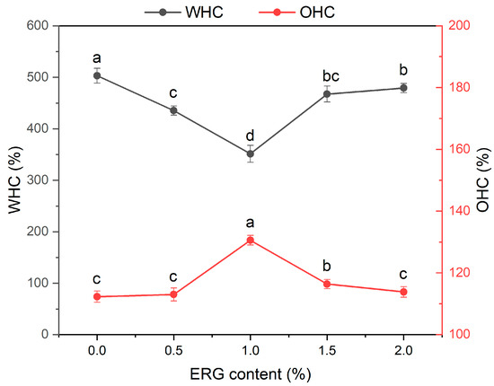 The effect of ERG content on the WHC and OHC of extrudates. Note: Different letters of the same indicator mean significant differences (p < 0.05) as determined by one-way ANOVA with Tukey’s post hoc test.
