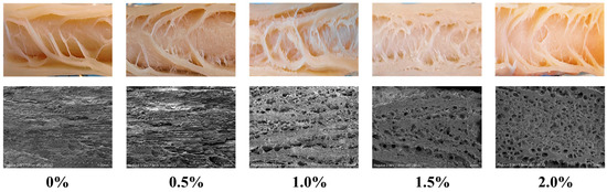 Scanning electron microscopy (SEM) provides high-resolution insights into the microstructural features of meat analogues, and when combined with macroscopic structural analysis, it provides comprehensive insights into their fibrous morphology [4]. As presented in Figure 4, macroscopic images of the extrudates demonstrated that without ERG addition, the fibrous structure was not distinctly visible, and a layered morphology was observed. Microscopic examination further indicated that the gel structure formed in the absence of ERG was relatively dense. In contrast, with increasing ERG addition, distinct fibrous structures became apparent in the extrudates. At an ERG addition level of 1.0%, the fibrous structure was most pronounced. However, a progressive increase in ERG content led to a gradual deterioration of the fibrous architecture. Microscopic analysis showed that the gel structure became porous and loose, with less distinct fiber orientation, which is consistent with the earlier measurements of the fibrous degree. These findings demonstrate that an appropriate amount of ERG promotes the emergence of a fibrous morphology in the extrudates. This can be attributed to the notable emulsifying properties of ergosterol [21], which enhance the fluidity of the feedstock system. During high-moisture extrusion, the velocity gradient of the protein melt during cooling is a critical factor for the emergence of a fibrous morphology in the extrudates [24]. These findings indicate that adding an appropriate amount of ERG facilitates the development of this structure. Conversely, excessive ERG addition hinders fiber formation and results in a looser structure. Firstly, the strong lubricating effect leads to an excessively high melt flow rate [33], impairing protein reaggregation in the cooling die. Secondly, the pronounced hydrophobic interactions of ERG inhibit the development of a protein gel network [31], which is unfavorable for the development of a well-oriented fibrous structure along the extrusion direction.