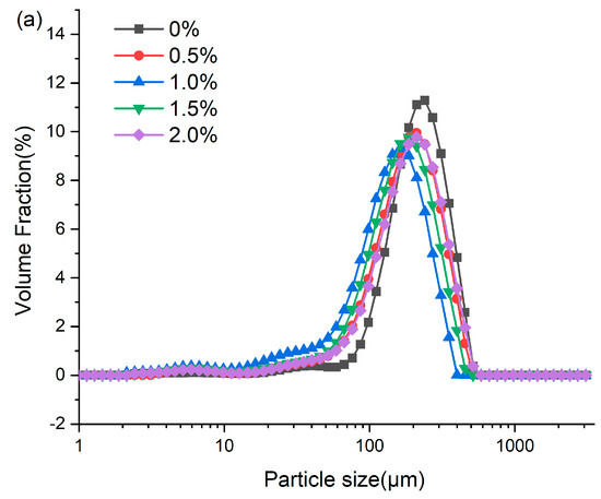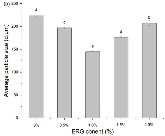 Analysis of the extrudate particle size distribution serves as a probe for characterizing protein aggregation during high-moisture extrusion [16]. As presented in Figure 5, the addition of ERG significantly influenced the granulometric profile of the extrudates. All samples exhibited a unimodal distribution, primarily within the range of 10–1000 μm. As the ERG content in the feedstock system increased, the mean particle size of the extrudates declined initially before rising. When the ERG addition level increased from 0% to 1.0%, the experimental results showed a diminution of the extrudates’ mean particle size. The primary reason for this is the strong hydrophobic interaction associated with ERG. As the ERG content increased, it inhibited the development of a protein gel network through hydrophobic interactions [31], thereby impeding protein aggregates of larger size formed and resulting in a reduction in average particle size. Conversely, when the ERG addition level exceeded 1.5%, the average particle size of the extrudates increased with further ERG addition. This phenomenon may be attributed to the amphiphilic nature of ergosterol, which confers emulsifying properties [21]. These findings indicate that the addition of ERG lubricated the feedstock system, reducing its viscosity and improving fluidity. However, excessive ERG, due to its strong lubricating effect, led to an excessively high melt flow rate, minimizing the dwell period of the melt in the extruder barrel. This reduced the energy absorbed by the material and lowered the melt temperature [33], resulting in incomplete protein denaturation during extrusion. Consequently, partial unfolding of the protein molecules was observed and disaggregated, leading to an increase in average particle size.