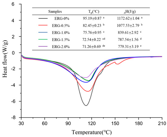 During high-moisture extrusion, the extent to which proteins are denatured directly influences the development of fibrous networks. Differential scanning calorimetry (DSC) finds common application in evaluating the denaturation level of proteins and the energy changes associated with protein conformational transitions during thermal processing [26]. The peak temperature (Tp) serves as an indicator of the thermal stability associated with protein conformational changes, while the enthalpy change (ΔH) indicates the extent to which proteins undergo aggregation within high-moisture extrudates [5]. As shown in Figure 6, all extrudates exhibited a major endothermic peak. Both the peak temperature (Tp) and denaturation enthalpy (ΔH) decreased with increasing ERG addition, suggesting that the presence of ERG resulted in structural alterations of the protein and compromised the extrudates’ thermal stability. This phenomenon may be attributed to the strong hydrophobic interactions associated with ERG [30]. As the ERG content in the feedstock system increased, ERG inhibited the formation of the protein gel network through hydrophobic interactions [31]. The new conformational state formed by the binding of ERG to proteins exhibited lower thermal stability compared to the native protein conformation, weakening the stability of the proteins against thermal transformation [35]. Consequently, the extrudates exhibited a drop in thermal stability, leading to reductions in Tp and ΔH.