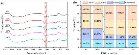 The FTIR spectra for the various samples are presented in Figure 7a. The amide I band (1700–1600 cm−1) is one of the characteristic infrared absorption bands of proteins and serves as a common tool for quantifying protein secondary structures [36]. Specific regions within this band correspond to distinct protein secondary structures: α-helix (1651–1660 cm−1), β-sheet (1600–1639 cm−1), β-turn (1661–1700 cm−1), and random coil (1640–1650 cm−1) [37]. As illustrated in Figure 7b, the relative content of secondary structures in the samples was determined by processing this spectral region using PeakFit 4.12 software. In protein secondary structures, α-helix and β-sheet are considered ordered structures, which contrast with the non-ordered arrangements of β-turns and random coils [38]. As shown in Figure 7b, all extrudates exhibited four types of protein secondary structures, predominantly composed of ordered structures (α-helix and β-sheet accounting for over 54% of the total). According to the results, the incorporation of ERG drove a conformational transition from β-turn to α-helix, which consequently increased the overall structural ordering of the protein. This phenomenon may be due to the shared stabilization of both α-helix and β-turn by intramolecular hydrogen bonds [11]. During high-moisture extrusion, mechanical shear forces cause the extension of protein molecular chains. The shorter-range hydrogen bonds in β-turn structures are more susceptible to disruption under such conditions. The incorporation of ergosterol introduces a rigid sterol ring structure, which suppresses random coiling of the protein chains, thereby favoring the establishment of long-range hydrogen bonds. This provides a structural framework conducive to the reconstruction of the α-helix [39]. These findings indicate that protein molecules undergo rearrangement throughout the high-moisture extrusion process, and the incorporation of ERG induces a structural shift in the protein, which β-turn structures transition into α-helices.