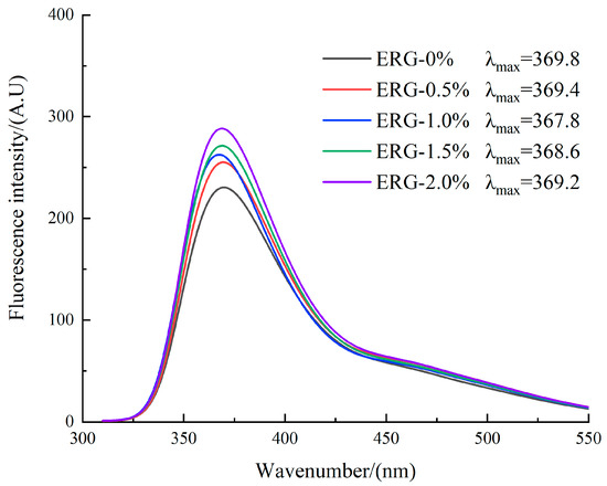 The principle of intrinsic fluorescence spectroscopy relies on its sensitivity to the local microenvironment of tryptophan (Trp) residues, thereby providing an effective means to monitor conformational changes in a protein’s tertiary structure [5]. The local environment of tryptophan can be assessed by its λmax: a value less than 330 nm correlates with a hydrophobic region, while a value greater than 330 nm correlates with a hydrophilic region [40]. As presented in Figure 8, the observed λmax values above 330 nm for all extrudates point to hydrophilic microenvironments surrounding the tryptophan residues. The fluorescence intensity gradually increased with higher ERG addition levels. Previous studies have shown that in native proteins, most tryptophan residues are buried within the protein interior. After extrusion processing, protein denaturation leads to the gradual exposure of tryptophan side chains, which typically reduces the fluorescence intensity due to quenching effects from the aqueous environment [41]. This generally results in weaker fluorescence intensity within the protein molecules. With an increase in ERG content from 0% to 1.0%, the fluorescence intensity gradually increased, while the λmax values decreased, indicating a blue shift in the spectrum. This phenomenon arises from the strong hydrophobic interactions conferred by the rigid sterol ring skeleton of ERG [30]. As ERG content increased, the tryptophan residues became surrounded by a hydrophobic environment. The formation of hydrophobic clusters reduced quenching effects [42], leading to a gradual enhancement in fluorescence intensity. Simultaneously, the increase in hydrophobic groups caused the tryptophan residues to reside in an environment of increased hydrophobicity, resulting in a decrease in the emission wavelength of λmax. When the ERG content further increased from 1.0% to 2.0%, the fluorescence intensity continued to rise, but the λmax values gradually increased, indicating a red shift. This may be due to the excessive lubricating effect of ERG, which reduced the complete application of thermal and mechanical energy on the protein melt [33]. These findings indicate that the incomplete unfolding and dispersion of protein molecules hindered the exposure of internal tryptophan residues, thereby causing a persistent increase in fluorescence intensity. Meanwhile, because of the amphiphilic nature of ERG [22], its hydrophobic groups participated in the reaggregation of protein molecules, while its hydrophilic groups caused the tryptophan residues to remain in a hydrophilic environment, which caused a red shift of λmax.