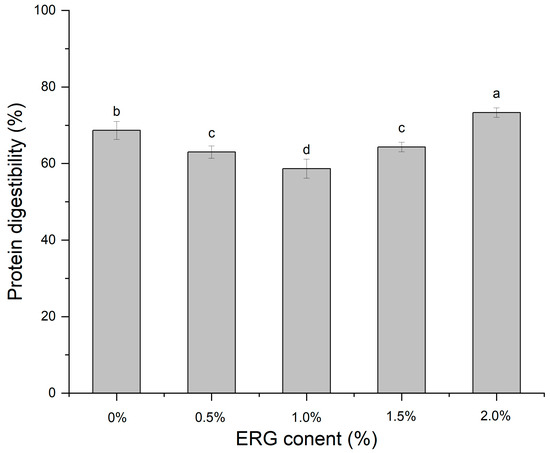 The effect of ERG content on the protein digestibility of extrudates. Note: Different letters of the same indicator mean significant differences (p < 0.05) as determined by one-way ANOVA with Tukey’s post hoc test.