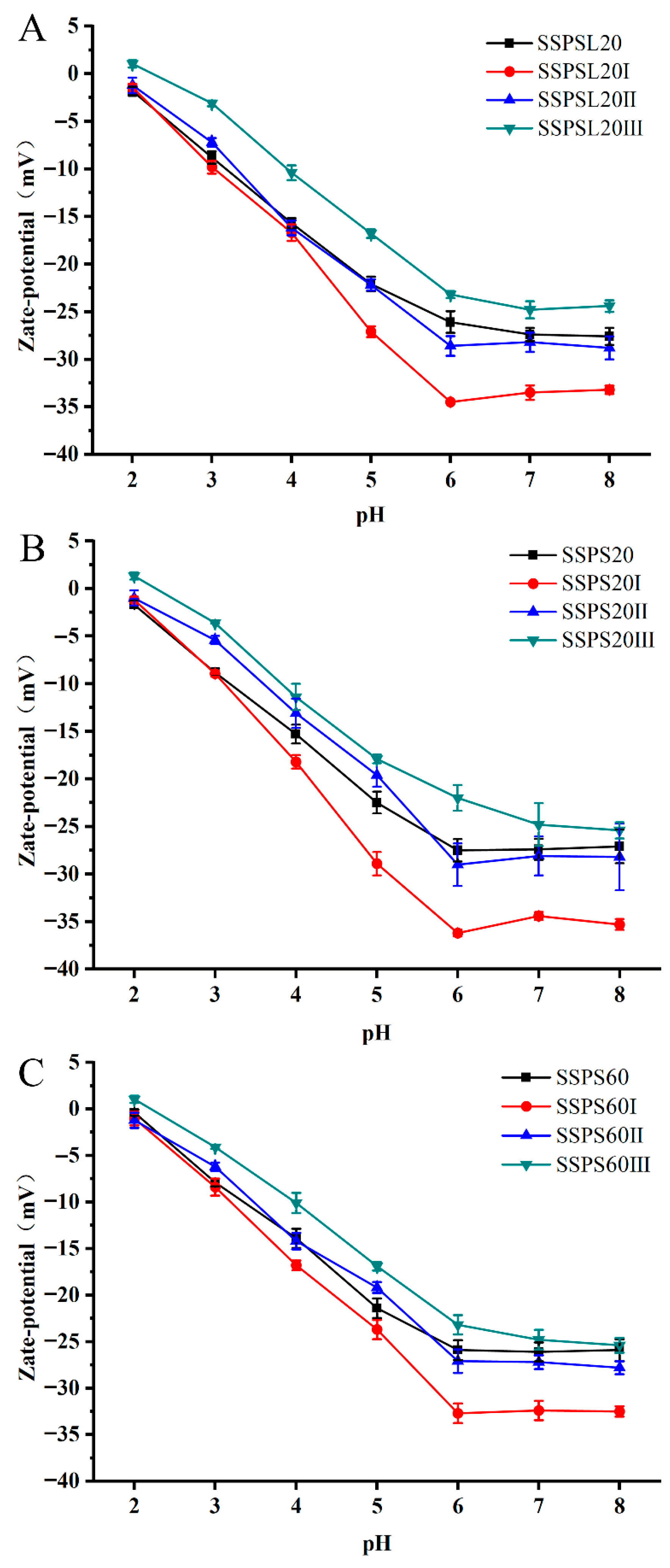The interplay between attractive and repulsive forces among colloidal particles plays a pivotal role in determining the stability and physicochemical properties of dispersions [22]. The zeta potentials of SSPS20, SSPS60, SSPSL20, and fractions with varying MW across a pH range of 2 to 8 are depicted in Figure 2. Given the variability in the GalA content across different fractions, zeta potential measurements were used to assess the surface charge of SSPS solutions. Within the tested pH ranges, the absolute zeta potential values of SSPS20 and its fractions were higher than those of SSPS60, while being similar to those of SSPSL20. As pH increased from 2 to 8, the zeta potential of SSPS20I decreased significantly from −1.1 mV to −35.3 mV, which can be attributable to the ionization of carboxylic groups. SSPS20I solutions exhibited larger zeta potentials, likely due to the higher GalA content in SSPS20I compared to other fractions and SSPS60I (refer to Table 2). These results indicate that the number of negative charges on SSPS significantly affects its dispersion and stabilization properties.