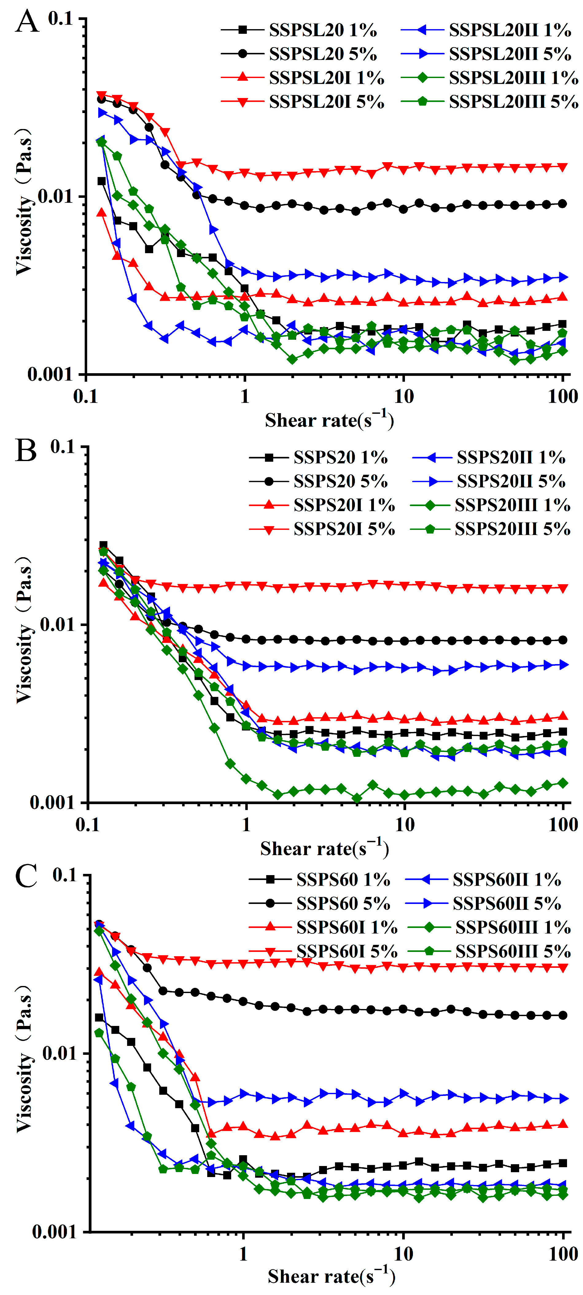 Figure 3 shows the apparent viscosity of three different types of SSPS and their fractions, at various concentrations in water. The results indicate that the apparent viscosity of all SSPS fractions increases with concentration; however, the values remain low even at higher concentrations. SSPS60 exhibited a higher apparent viscosity than SSPS20 and SSPSL20. The highest apparent viscosity among the samples was 0.0314 Pa s, observed for 5 wt% SSPS60I solution. The rheological property of viscosity in polymers is predominantly influenced by factors such as the polymer’s molecular mass and the rigidity of its molecular chains [16]. At a low shear rate (0.1–1 s−1), all SSPS fractions and solutions at different concentrations exhibited shear-thinning behaviors. A Newtonian plateau appeared at shear rates above 1 s−1, and this plateau broadened at higher concentrations of SSPS and SSPSI solutions. It is important to note that the shear-thinning behavior of SSPS in water differs from that of typical linear polymers. The apparent viscosity curves confirmed the shear-thinning behavior of SSPS and their fraction solutions, which followed the power-law model. As shown in Table 4, the flow behavior index (n) for 1% and 5% SSPS solutions and all fraction solutions was close to 1.0, indicating a near-Newtonian behavior. Consequently, acidic milk drinks stabilized with SSPS exhibit lower viscosity and a light taste without stickiness.