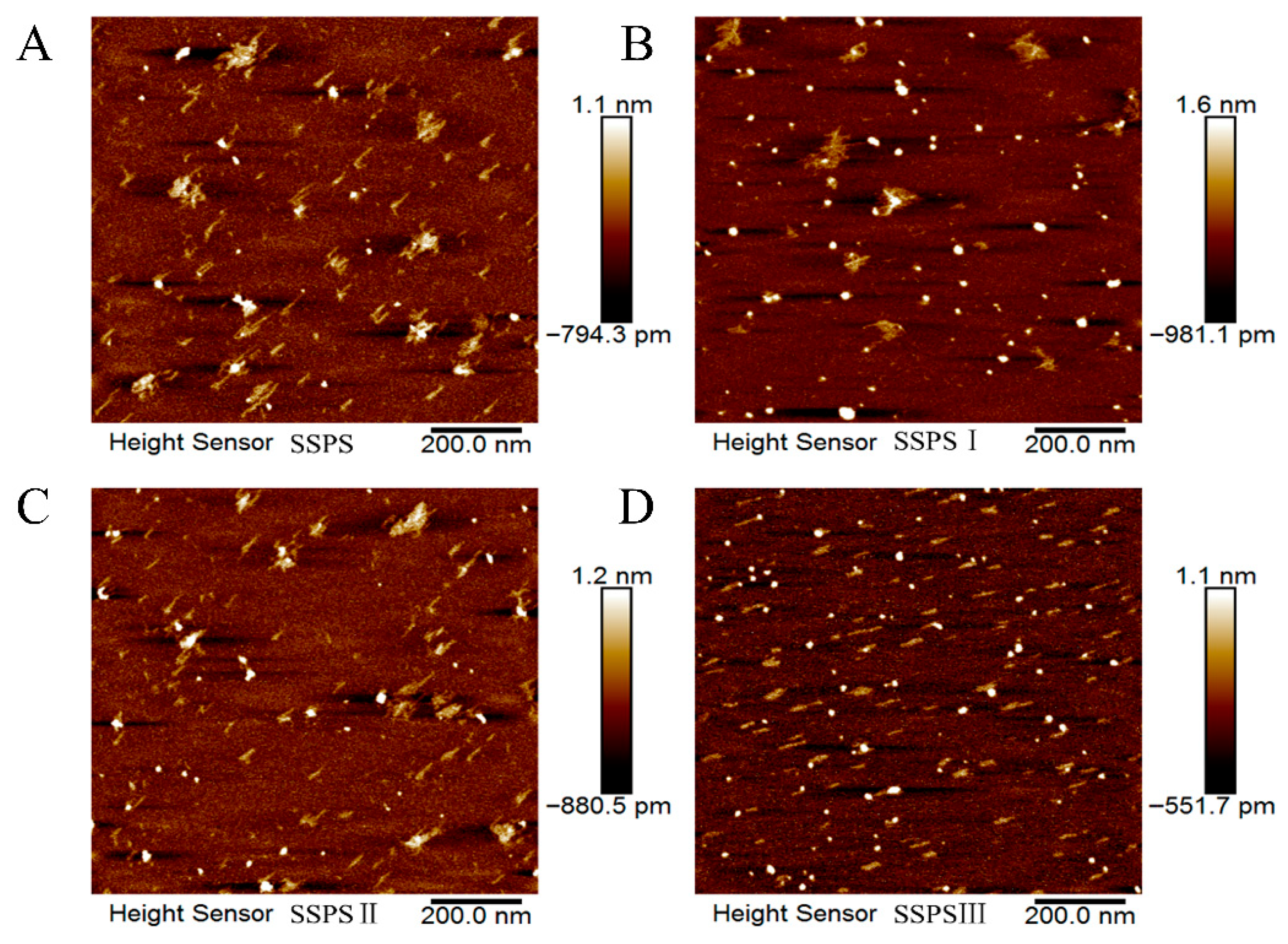 The 1 mg/mL SSPS fraction water solution was prepared and diluted to 1–5 μg/mL using deionized water and 2 mM Tween-20 aqueous solution. The 2 μL of the diluted samples were immediately dropped onto freshly cleaved mica surfaces and dried in an enclosed Petri dish for 5 h [18]. The images of the Atomic force microscope (AFM) were obtained in the air at 20 °C and scanned in tapping mode using a silicon nitride cantilever (Bruker, Billerica, MA, USA) with a nominal radius of the pyramidal tip of 2 nm. Images of SSPS were obtained by the Nanoscope Analysis software (version 1.70, Bruker, Billerica, MA, USA).